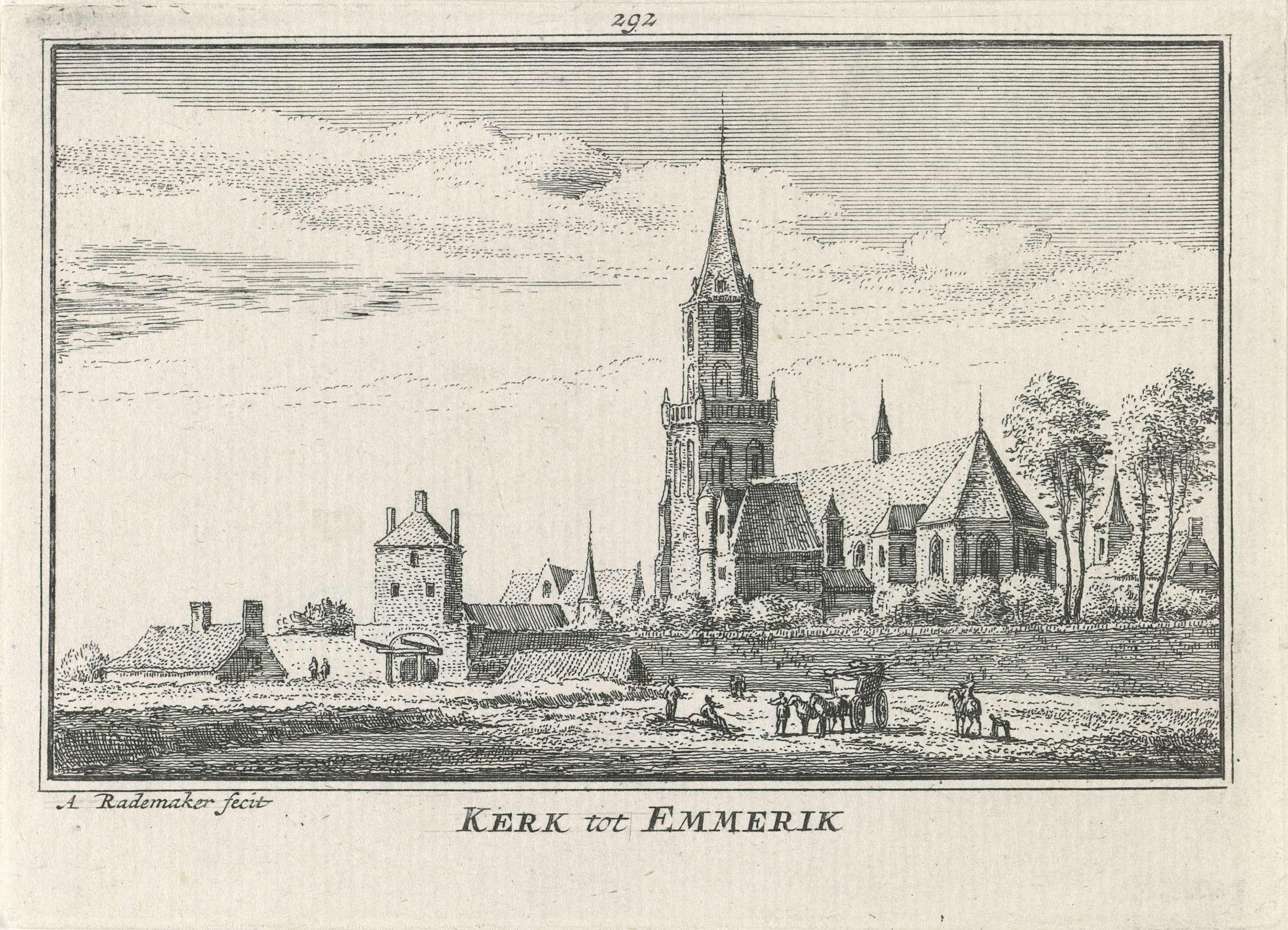 Gezicht op de achterzijde van de St. Aldegundiskirche te Emmerik. Op de voorgrond een wagen en enkele figuren.