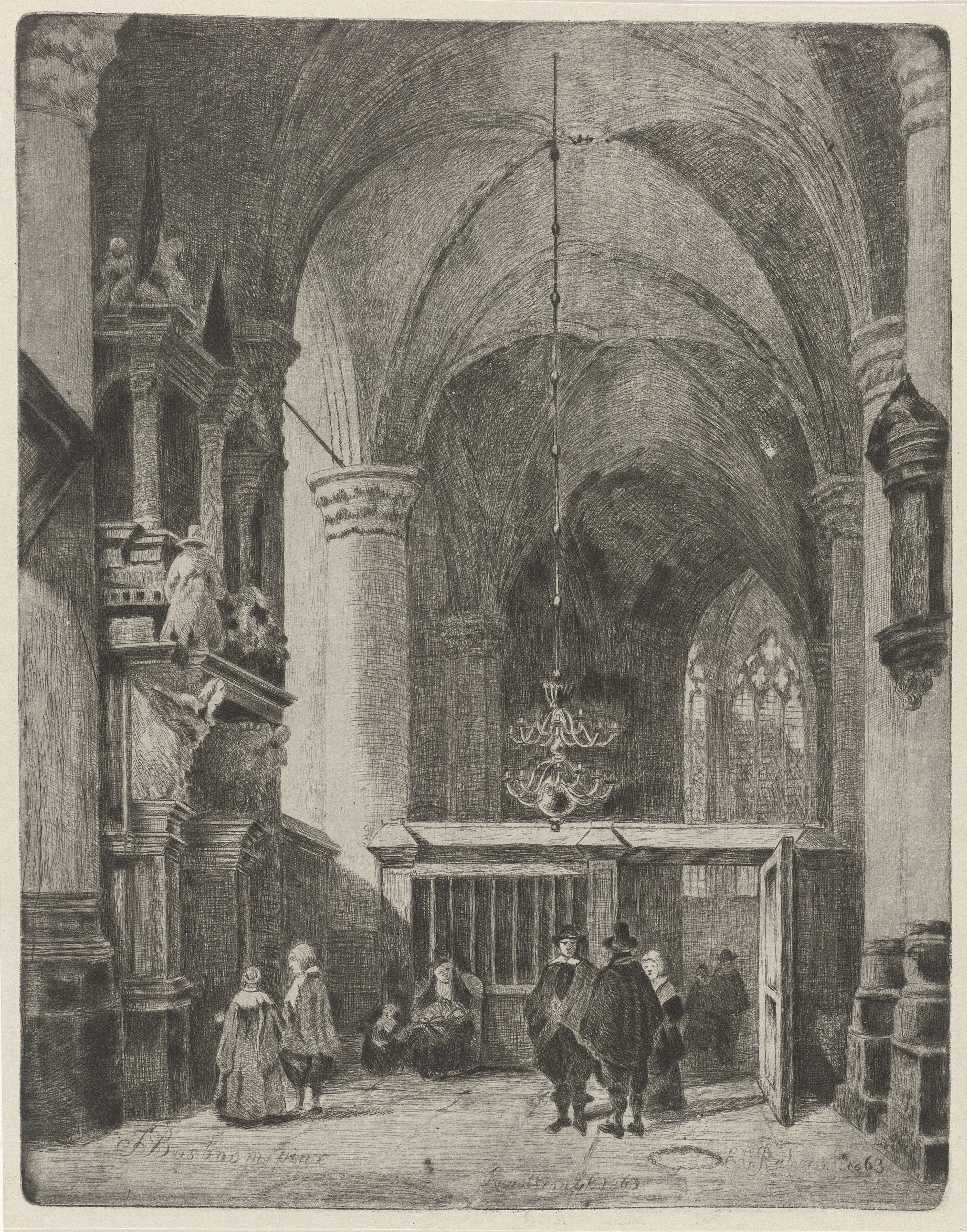 Interieur van een kerk, met op de voorgrond enkele figuren.