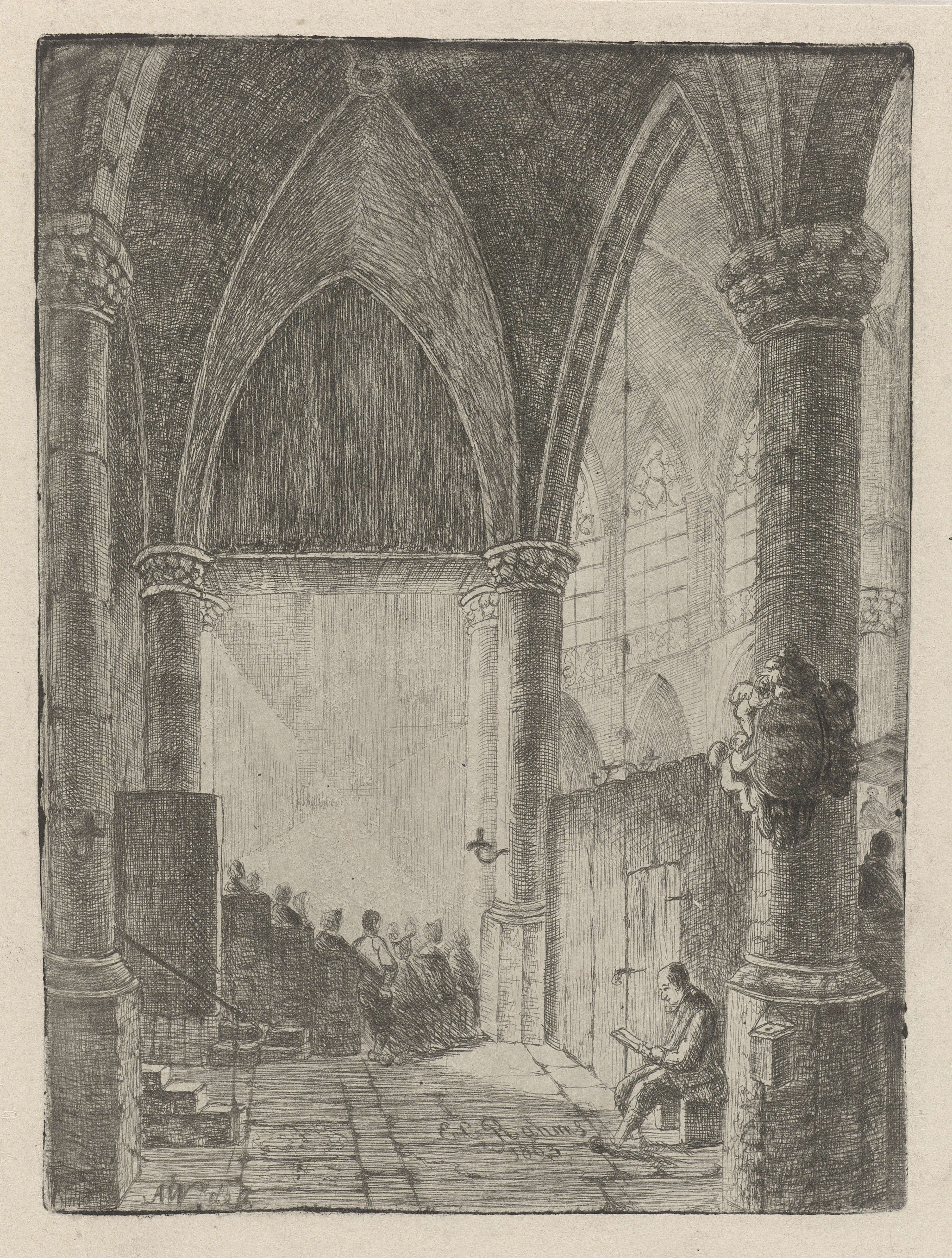 Gezicht op een kerkinterieur waar een kerkdienst wordt gehouden. Op de voorgrond zit een man te lezen.