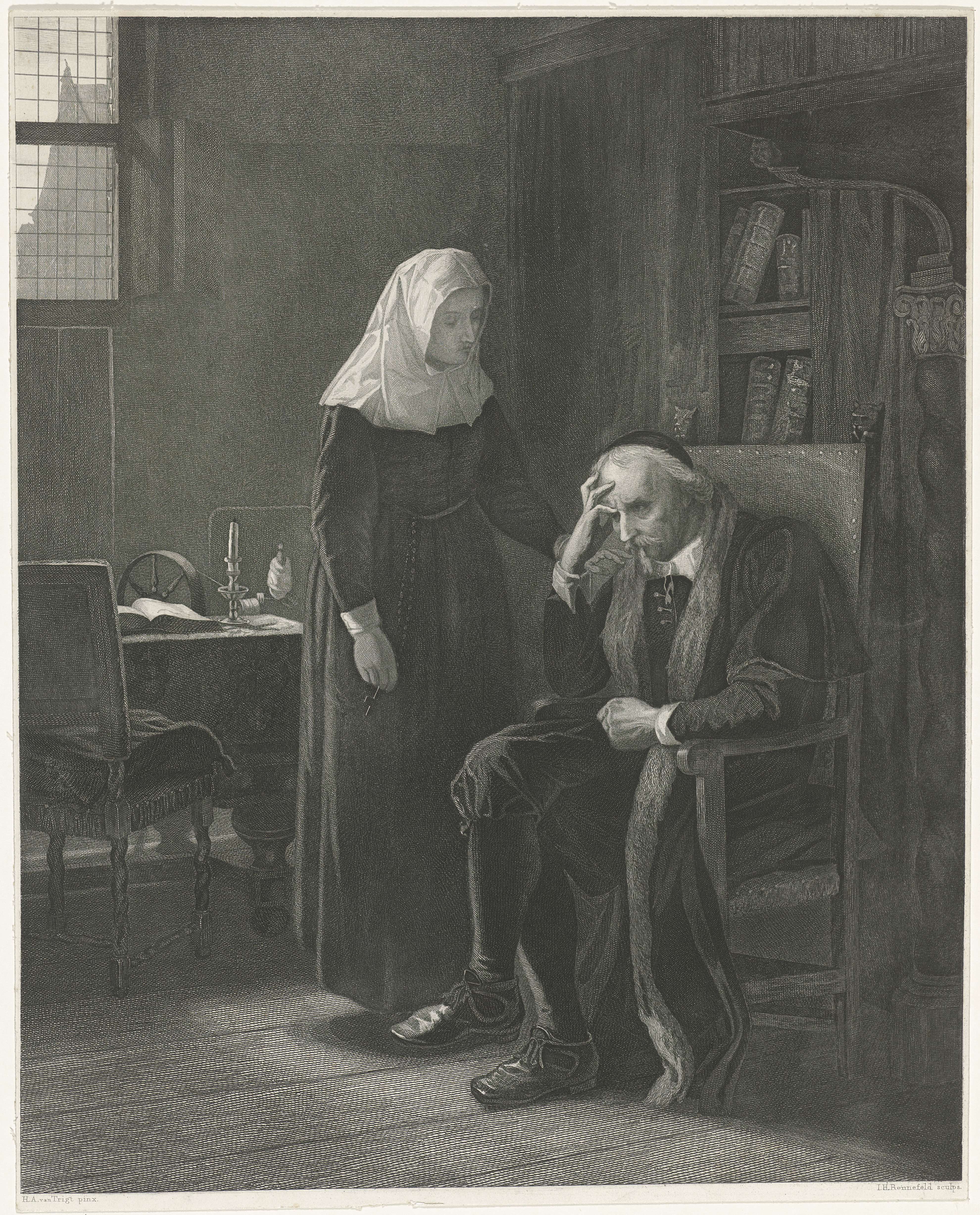 In een vertrekt zit Joost van den Vondel peinzend op een stoel. Zijn dochter staat naast hem en raakt zijn schouder aan.