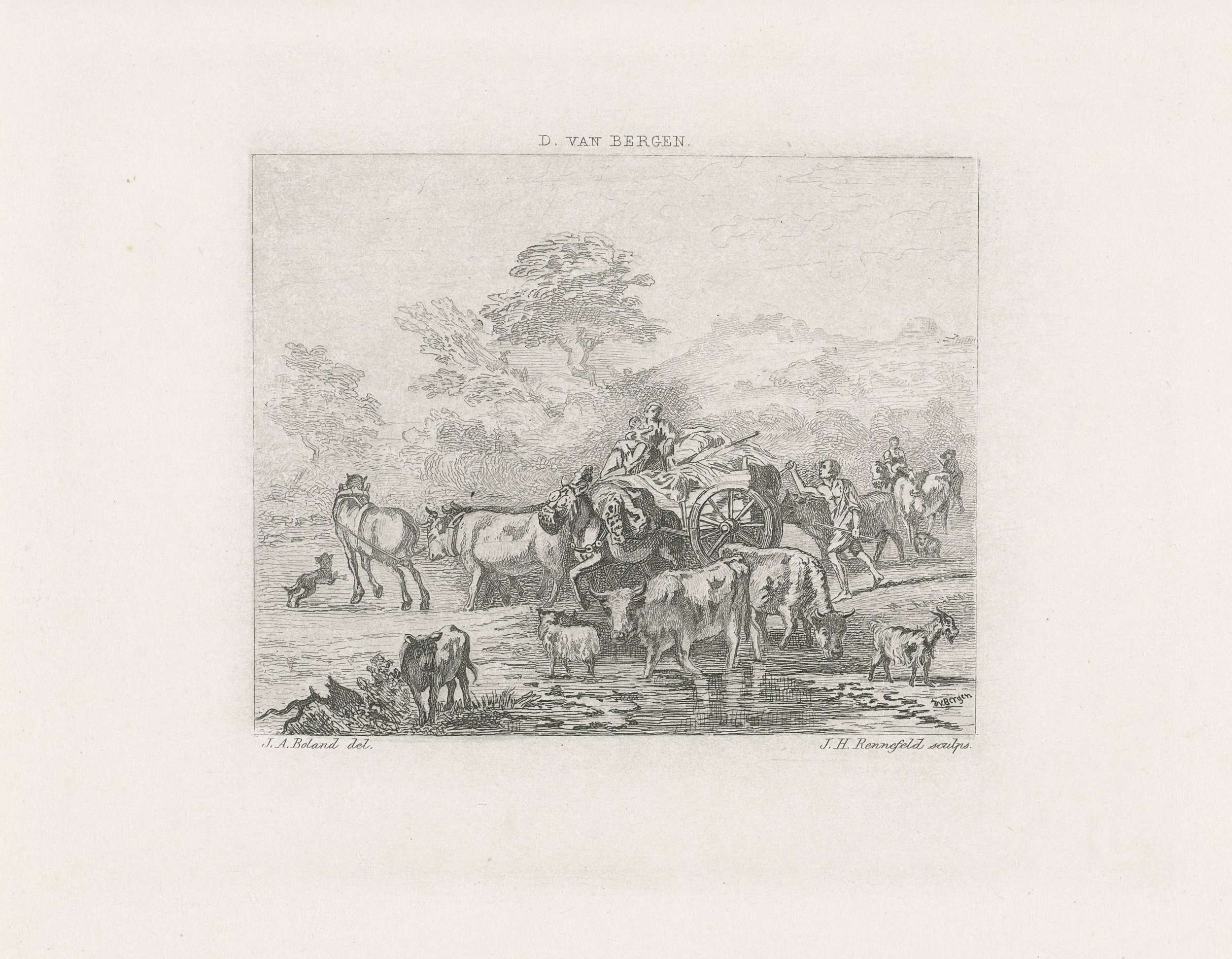 Gezicht op een landschap met een beek waar een volgeladen kar doorheen rijdt. Op de voorgrond koeien en geiten.