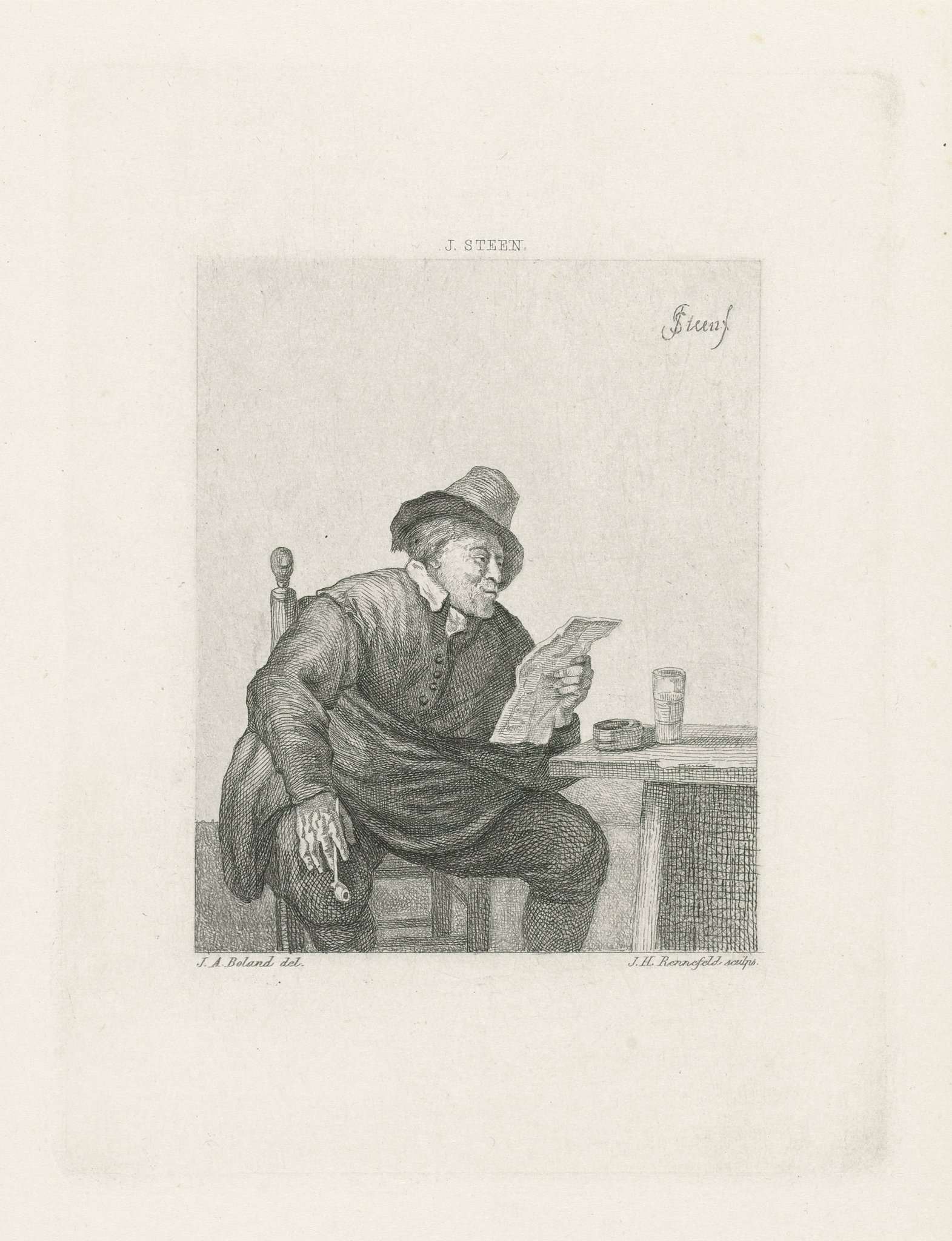 Bij een tafel leest een man een brief. Hij heeft een pijp in zijn hand en op de tafel staat een glas met drank.