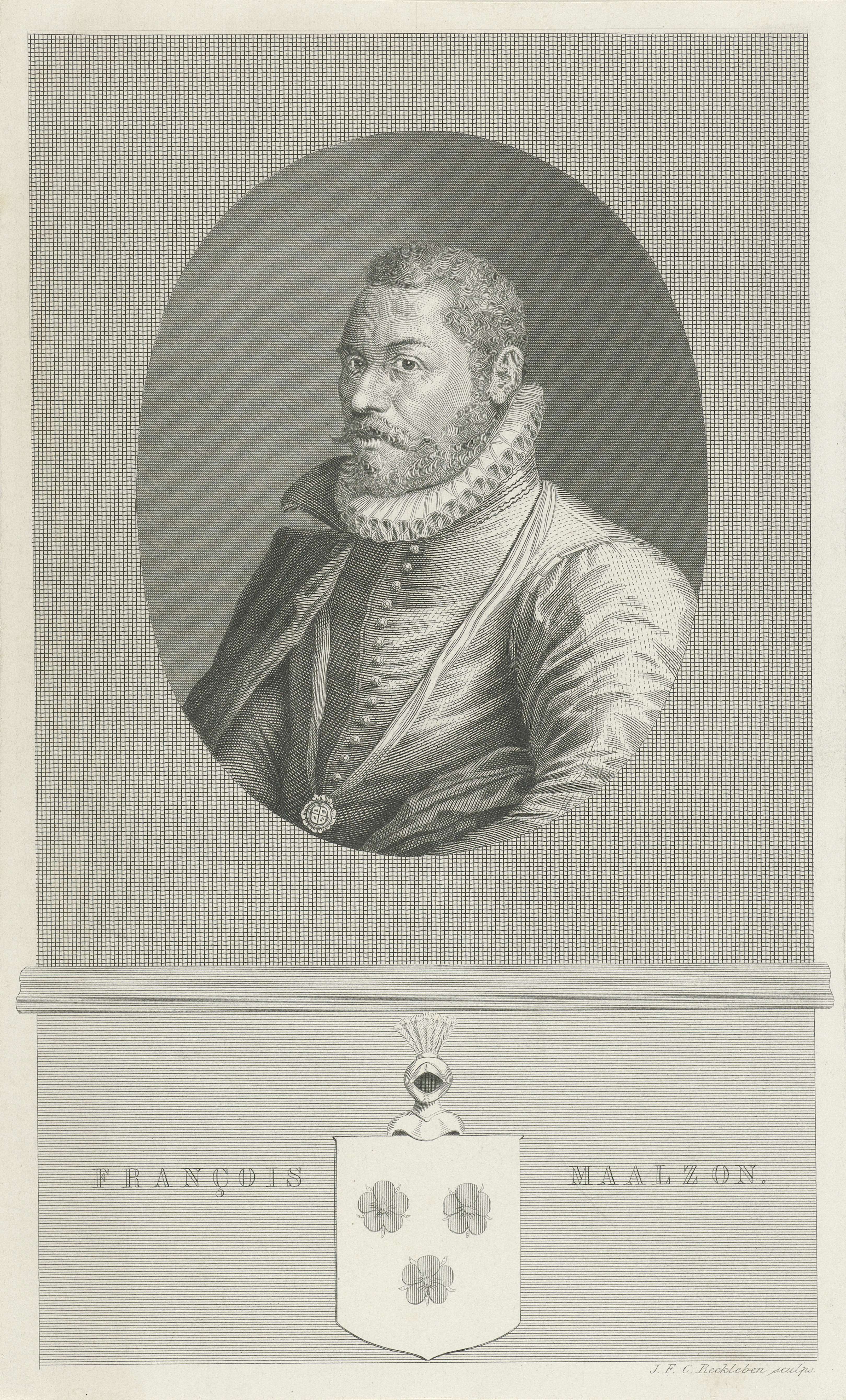 Portret van François Maelson, medicus en staatsman. In de marge zijn naam en familiewapen.