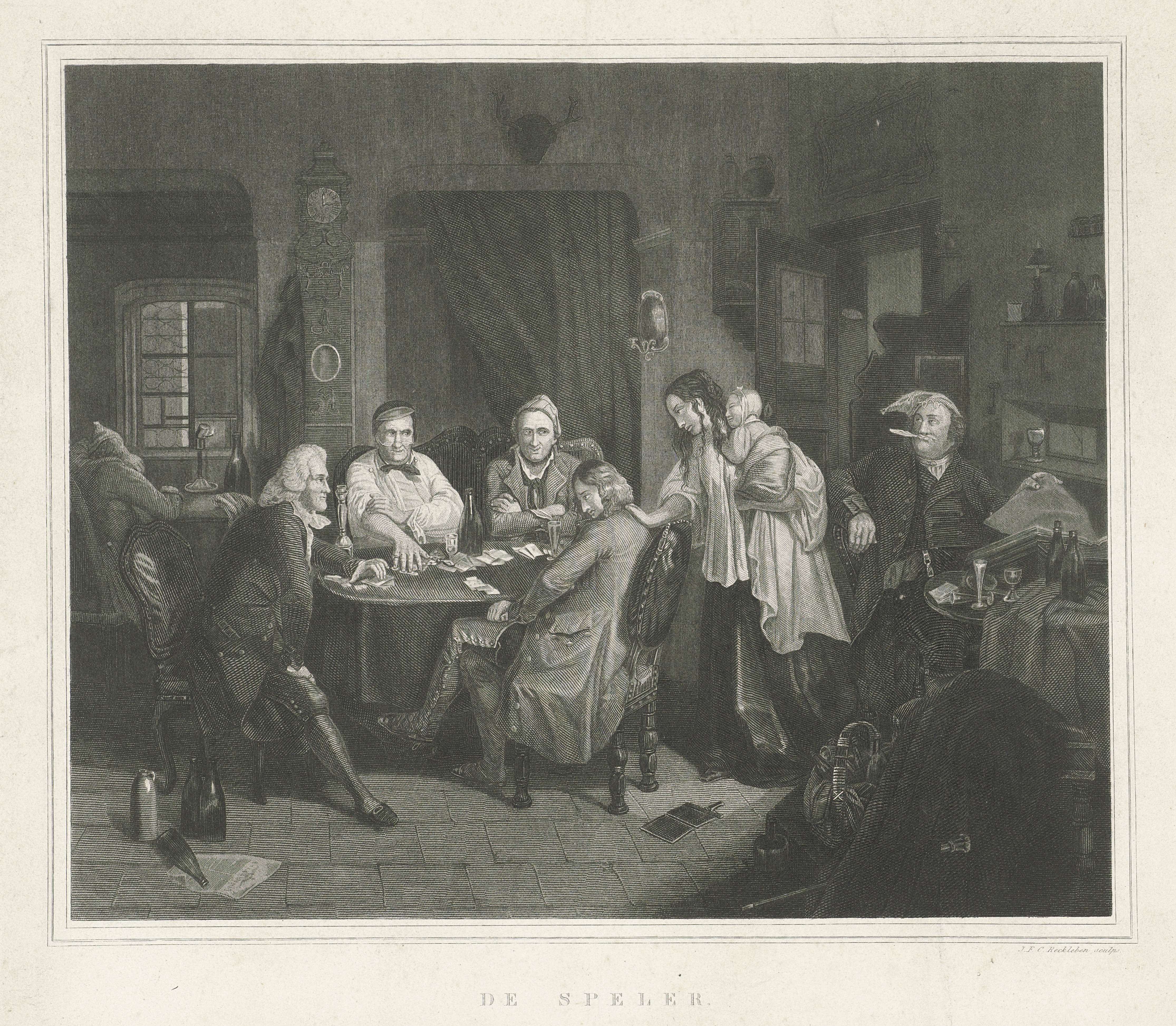 In een vertrek zitten vier mannen rond een tafel te kaarten. Een van de mannen heeft het spel en daarmee zijn geld verloren. De winnaar van het spel, aan de andere kant van de tafel, schuift geld en een horloge naar zich toe. Rechts slaat een man, met schrijfveer in de mond, het tafereel gade.
