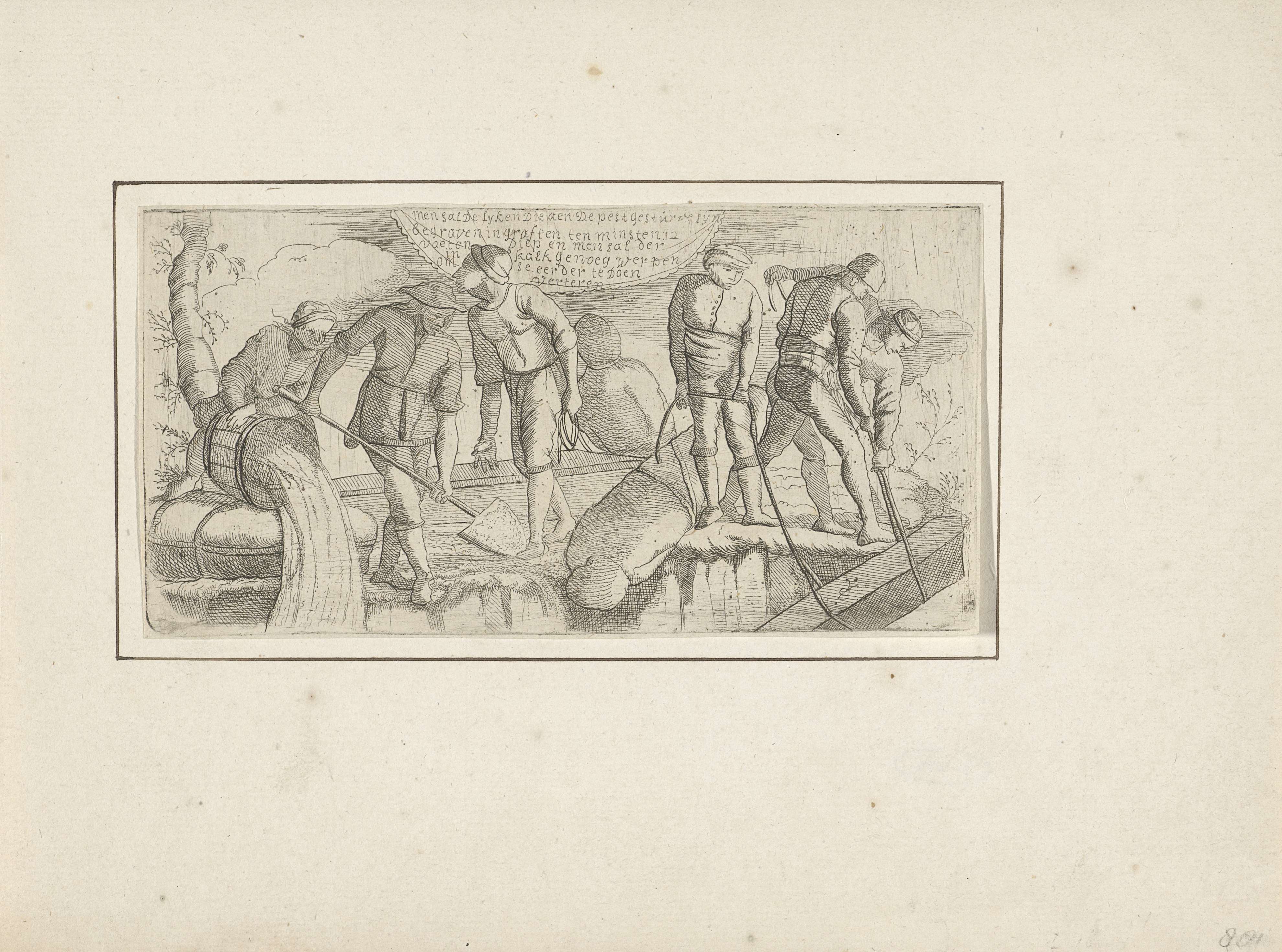 Een aantal mannen is druk bezig om lijken van slachtoffers van de pest te begraven. De tekst boven de prent beschrijft dat de stoffelijke overschotten minstens 12 voeten diep begraven zullen worden en dat ze bestrooid worden met kalk om het ontbindingsproces te versnellen.