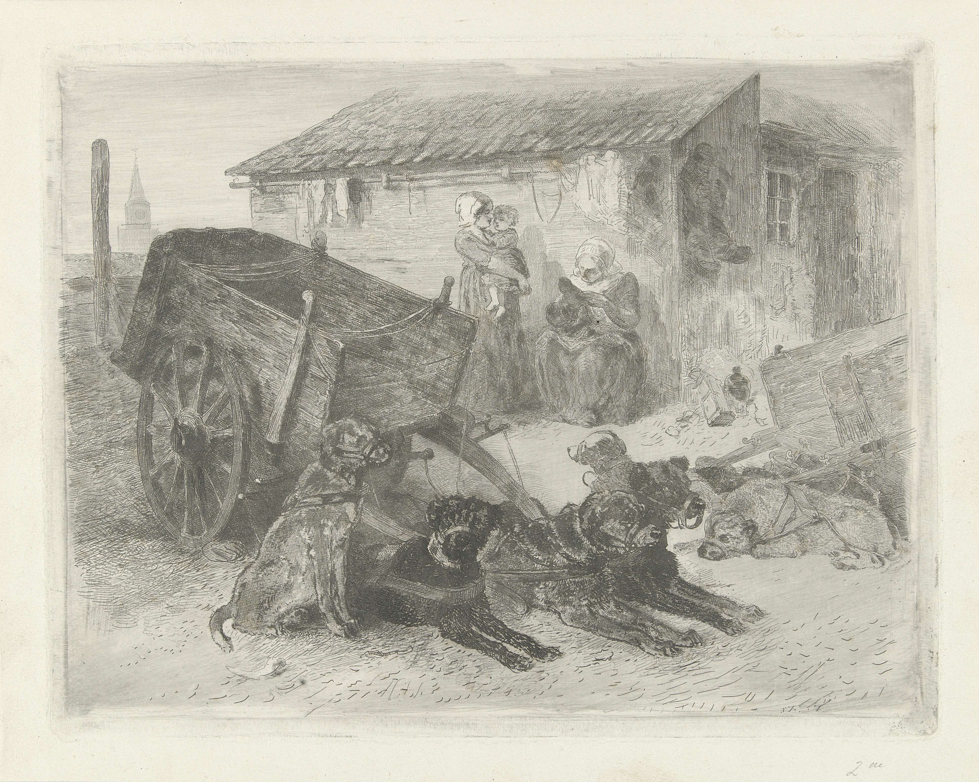 Twee hondenwagens met aangelijnde honden voor een woning. Bij het huis twee vrouwen en een kind.