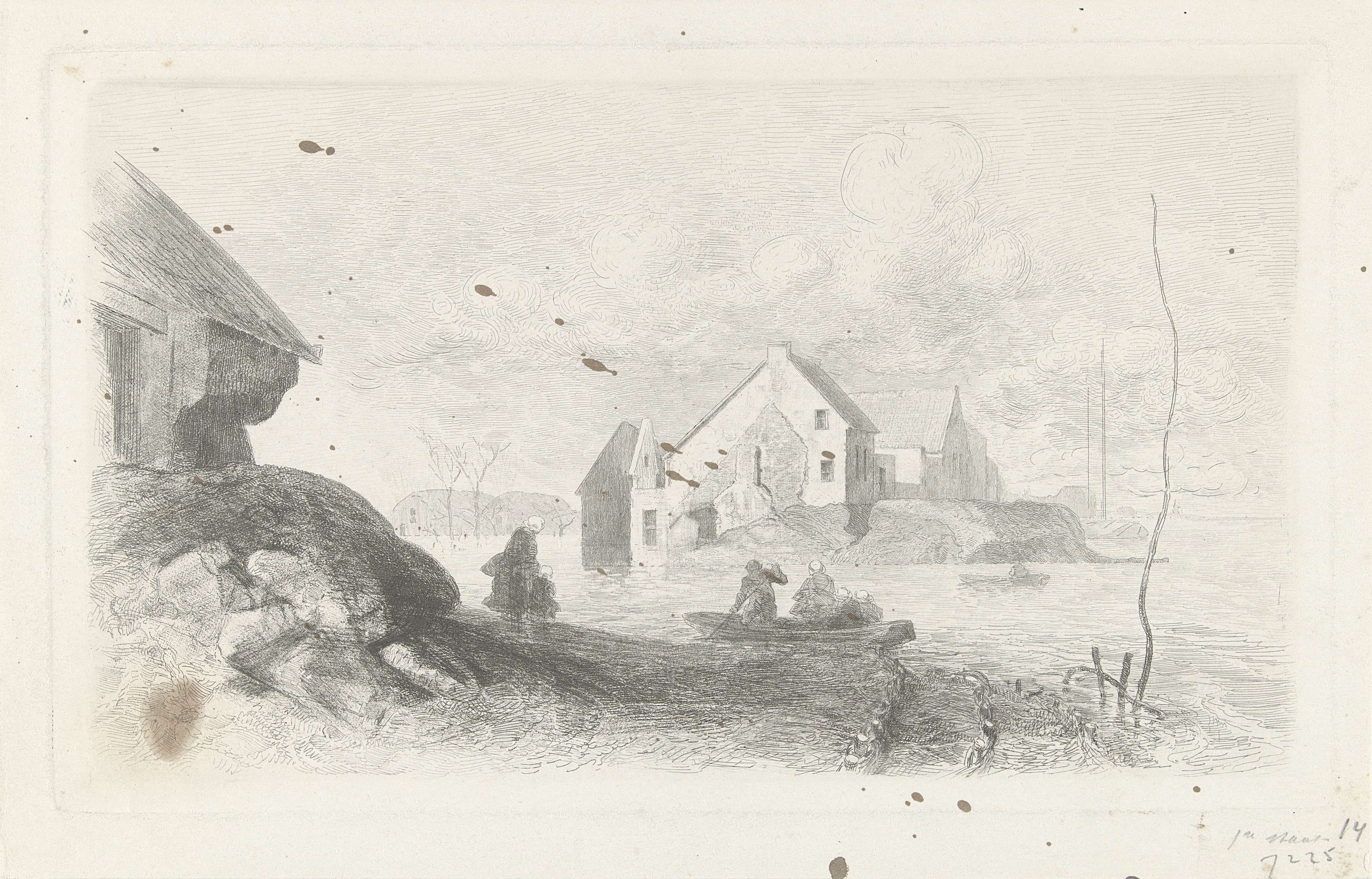 Overstroming in het dorp Lith. Met een roeiboot wordt een aantal personen geëvacueerd. De prent is deel van een serie van 24 prenten over de Watersnoodramp van 1855.