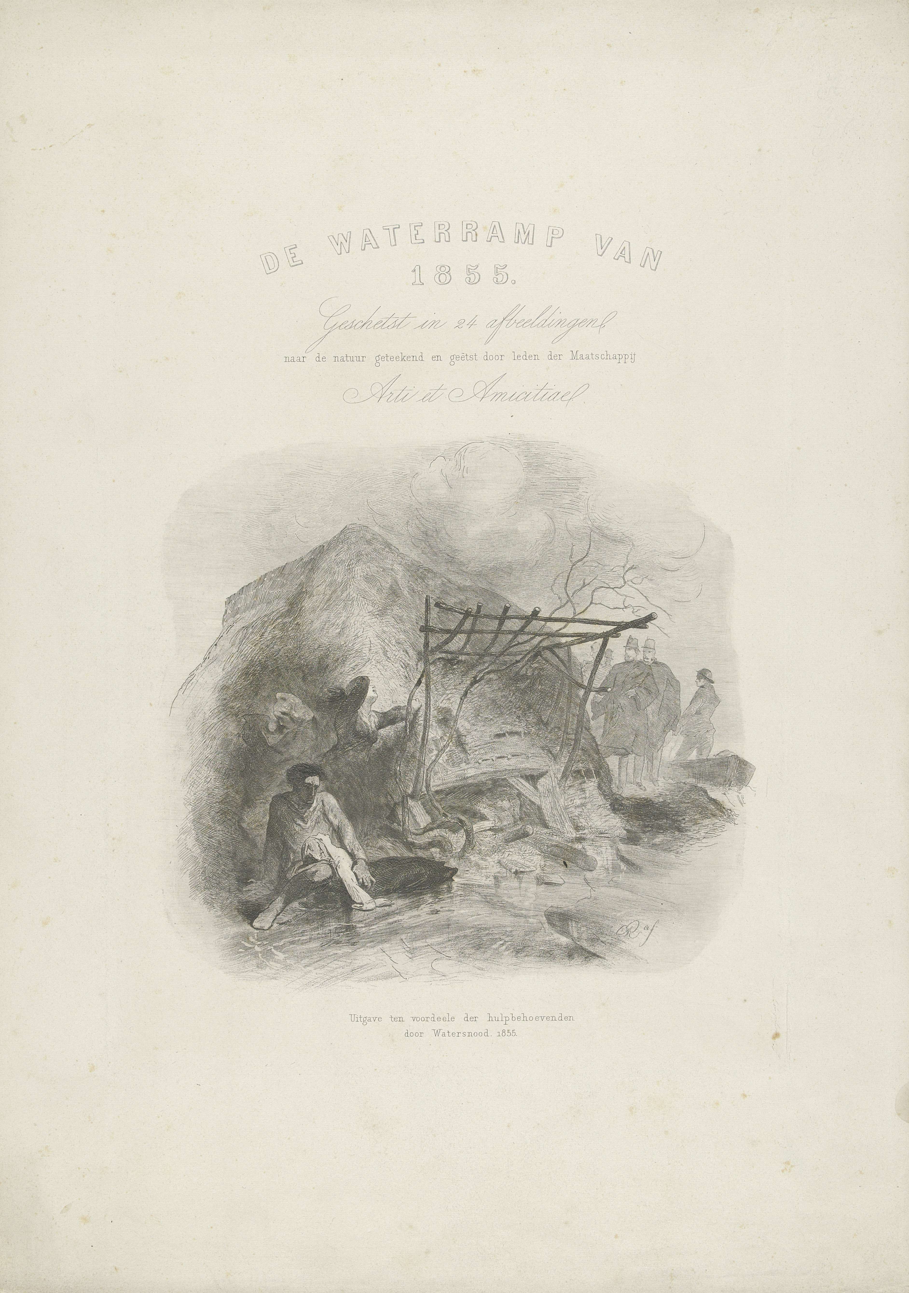 Bij een in elkaar gezakte hut bevinden zich slachtoffers van de watersnoodramp van 1855. Rechts een aantal reddingsmedewerkers. Titelprent voor een serie van 24 prenten over de Watersnoodramp van 1855.