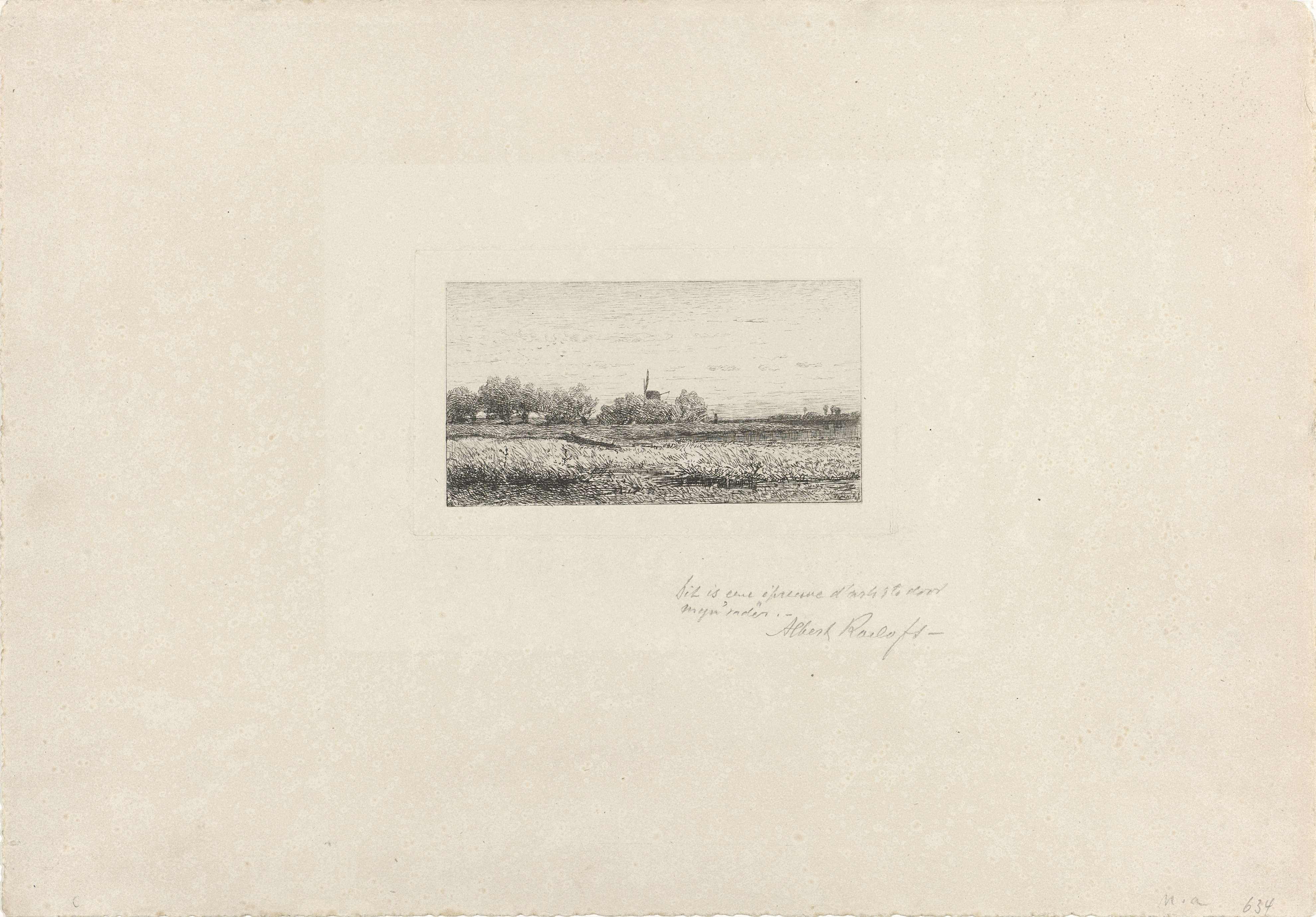 Gezicht op een landschap met waterplassen. Links een bootje en op de achtergrond een molen en een groep knotwilgen.