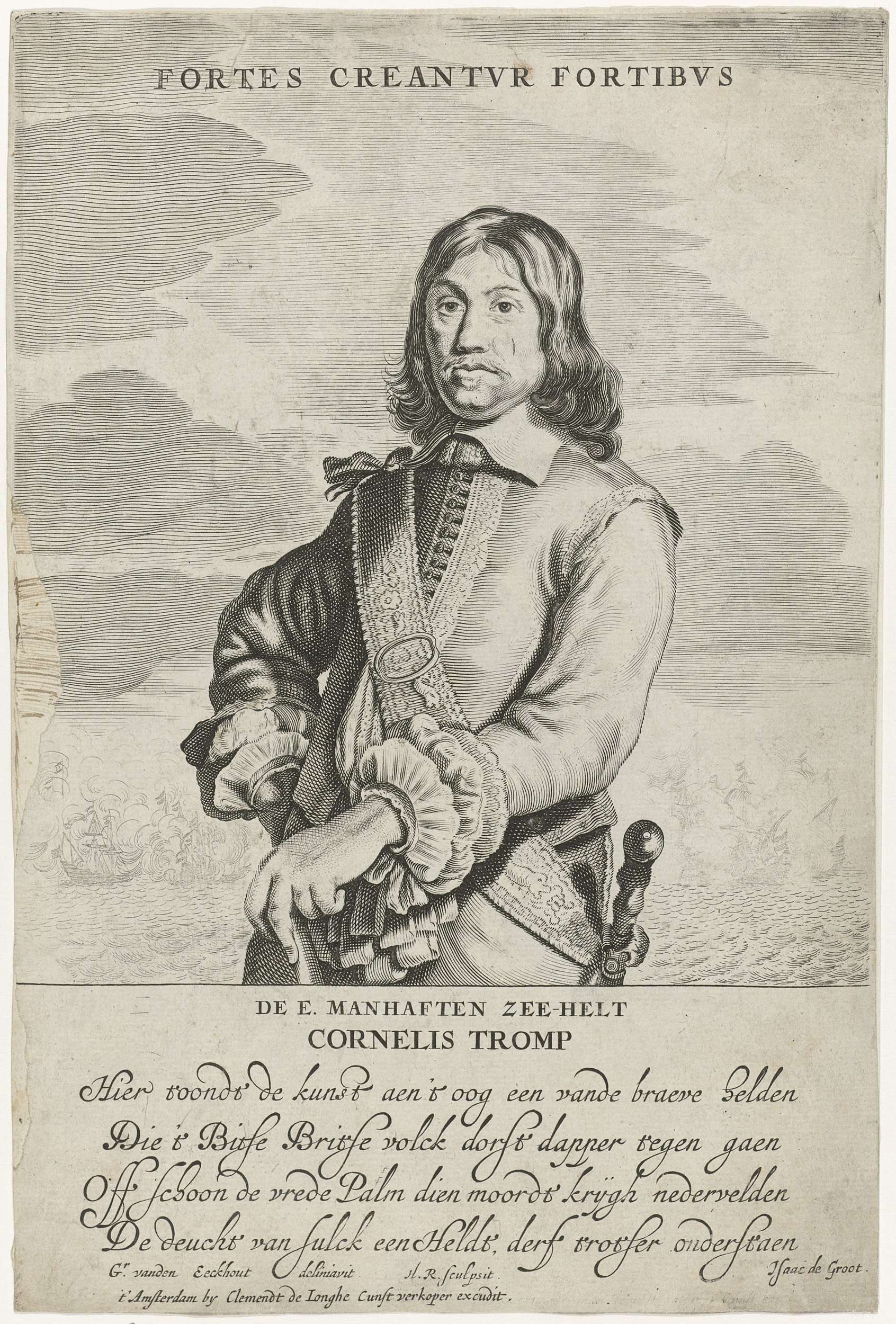 Portret van Cornelis Tromp, luitenant-admiraal van Holland en West-Friesland. Op de achtergrond een zeeslag. In de marge zijn naam en een lofdicht.