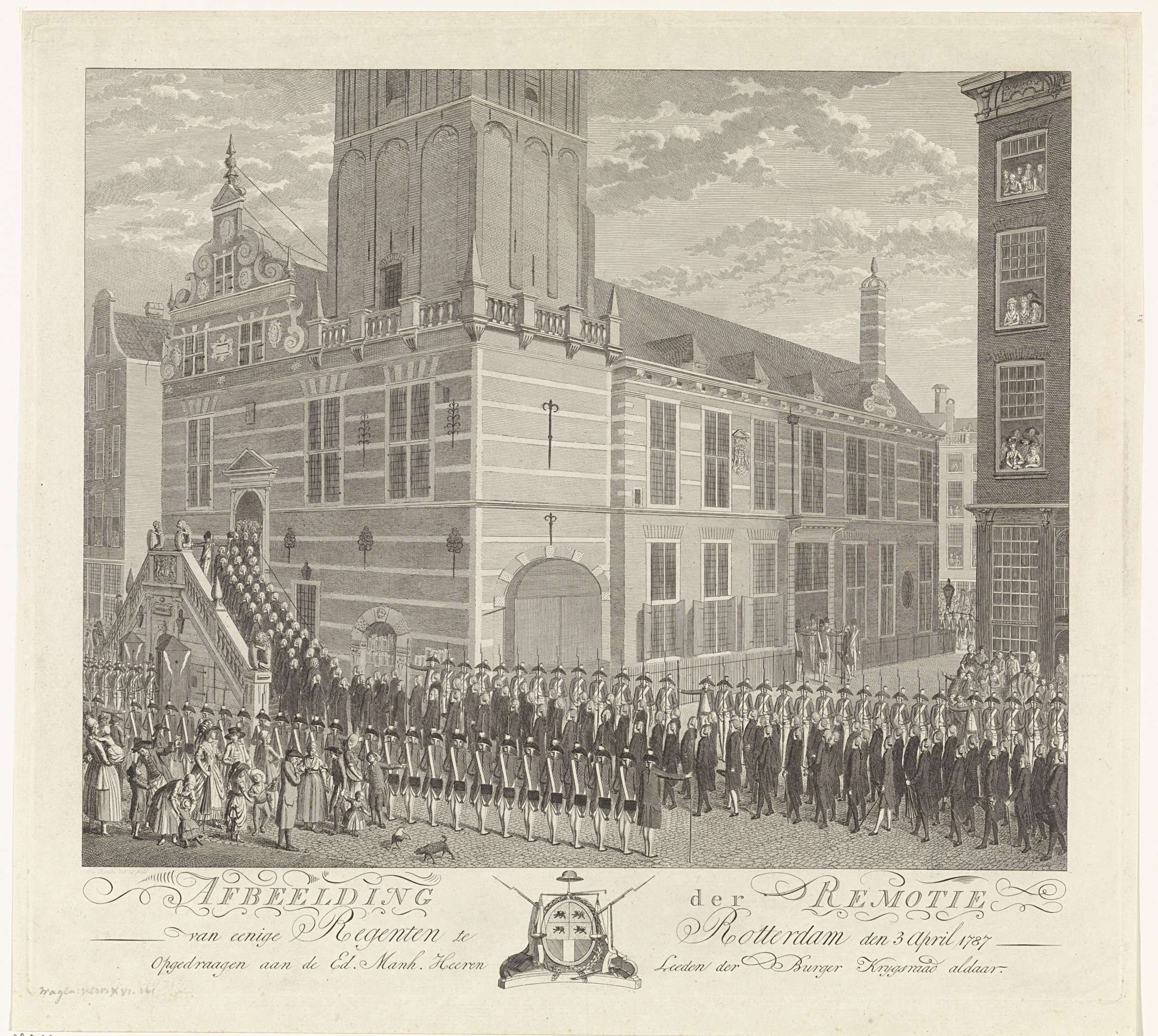 Gezicht op het oude stadhuis van Rotterdam, waar op 3 april 1787 zeven regenten werden afgezet. Vanaf de straat en vanuit de omliggende huizen kijken mensen toe. De prent is opgedragen aan 'Ed. Manh. Heeren Leeden der Burger Krygsraad' van Rotterdam.