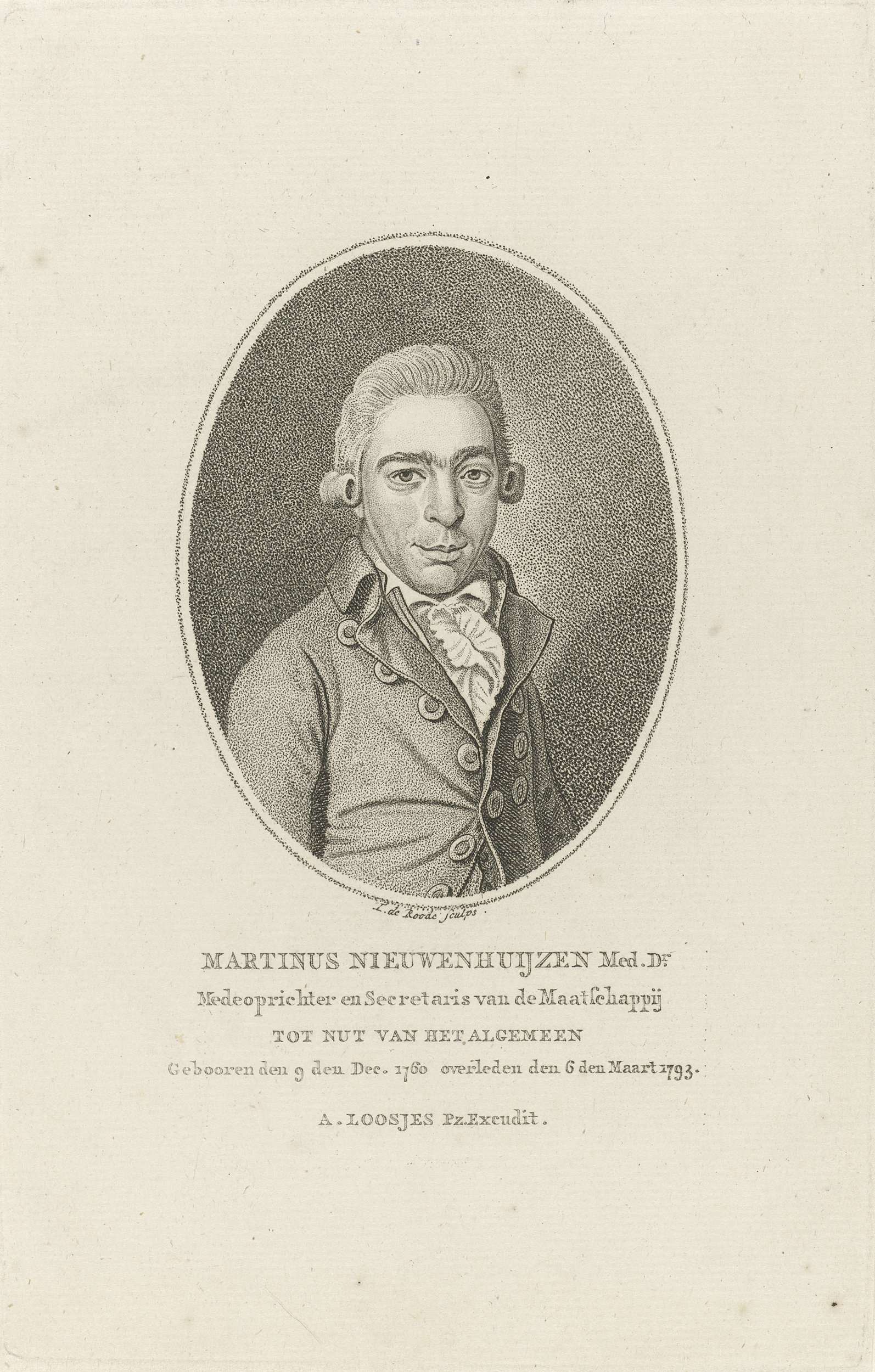 Portret van Martinus Nieuwenhuyzen, ter gelegenheid van zijn overlijden. Hij was pionier op het gebied van onderwijs en volksontwikkeling. Onder zijn portret zijn naam en titels.