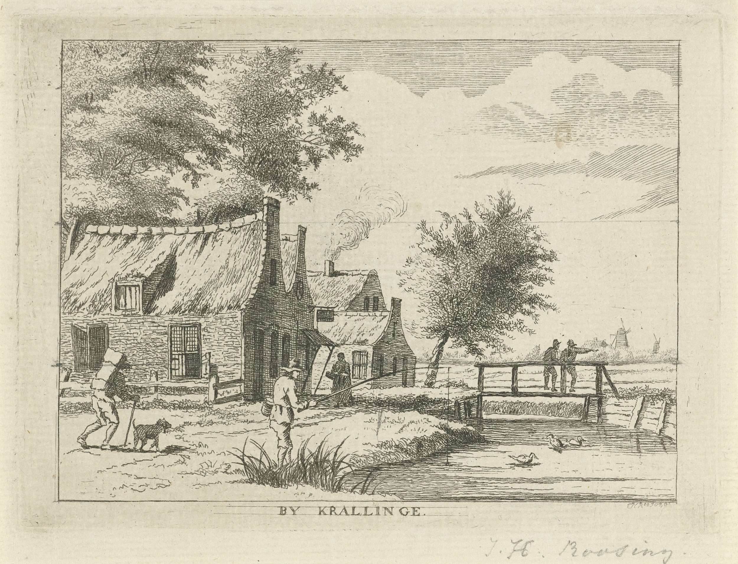 Gezicht op een dorp bij Kralingen. Op de voorgrond een visser aan de waterkant van een vaart en op de achtergrond de contouren van een dorp.
