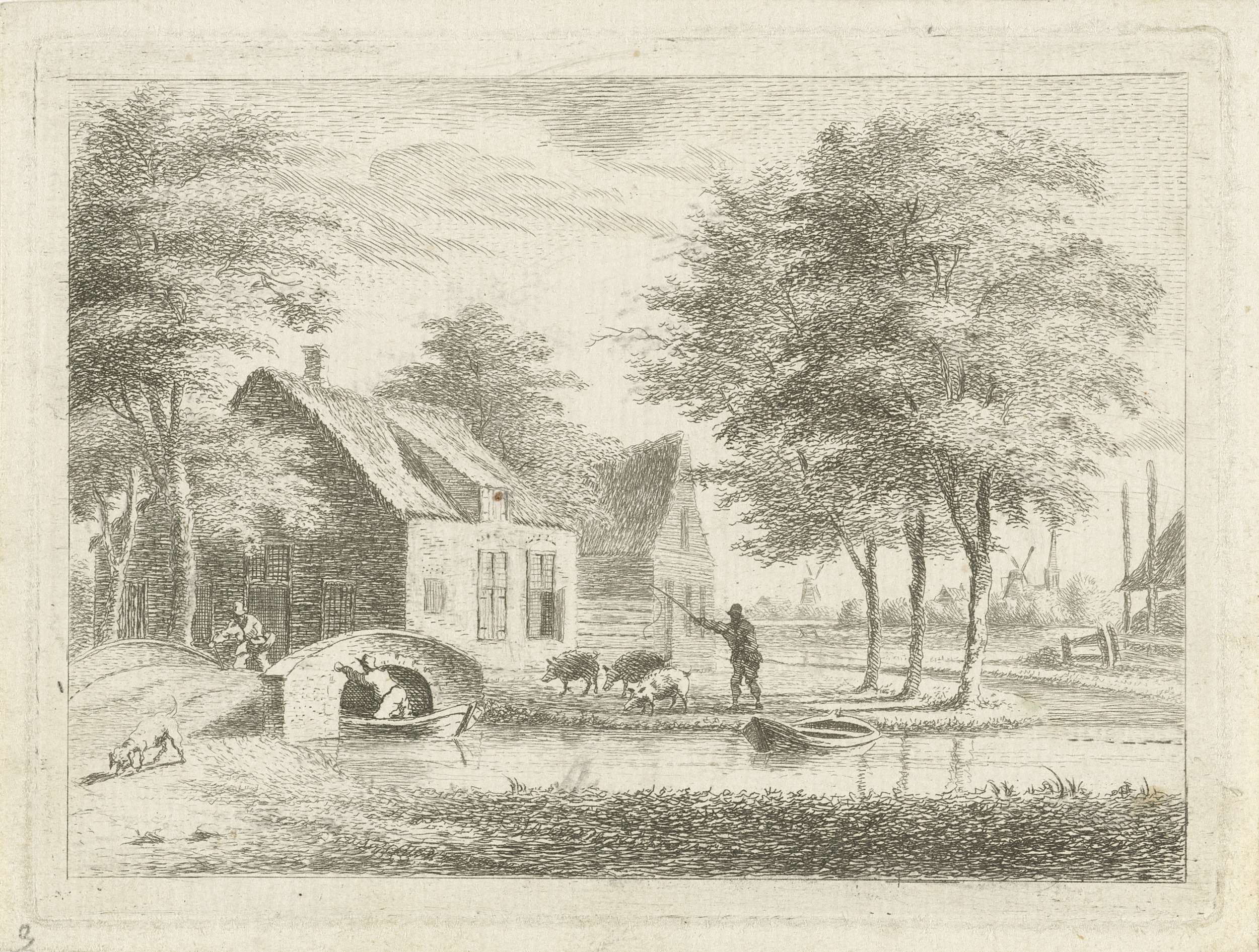 Gezicht op een boerderij aan een riviertje. Links een stenen brug waar een bootje onderdoor vaart. Bij de hoeve een man die drie varkens voortdrijft. Op de achtergrond de contouren van een dorp.