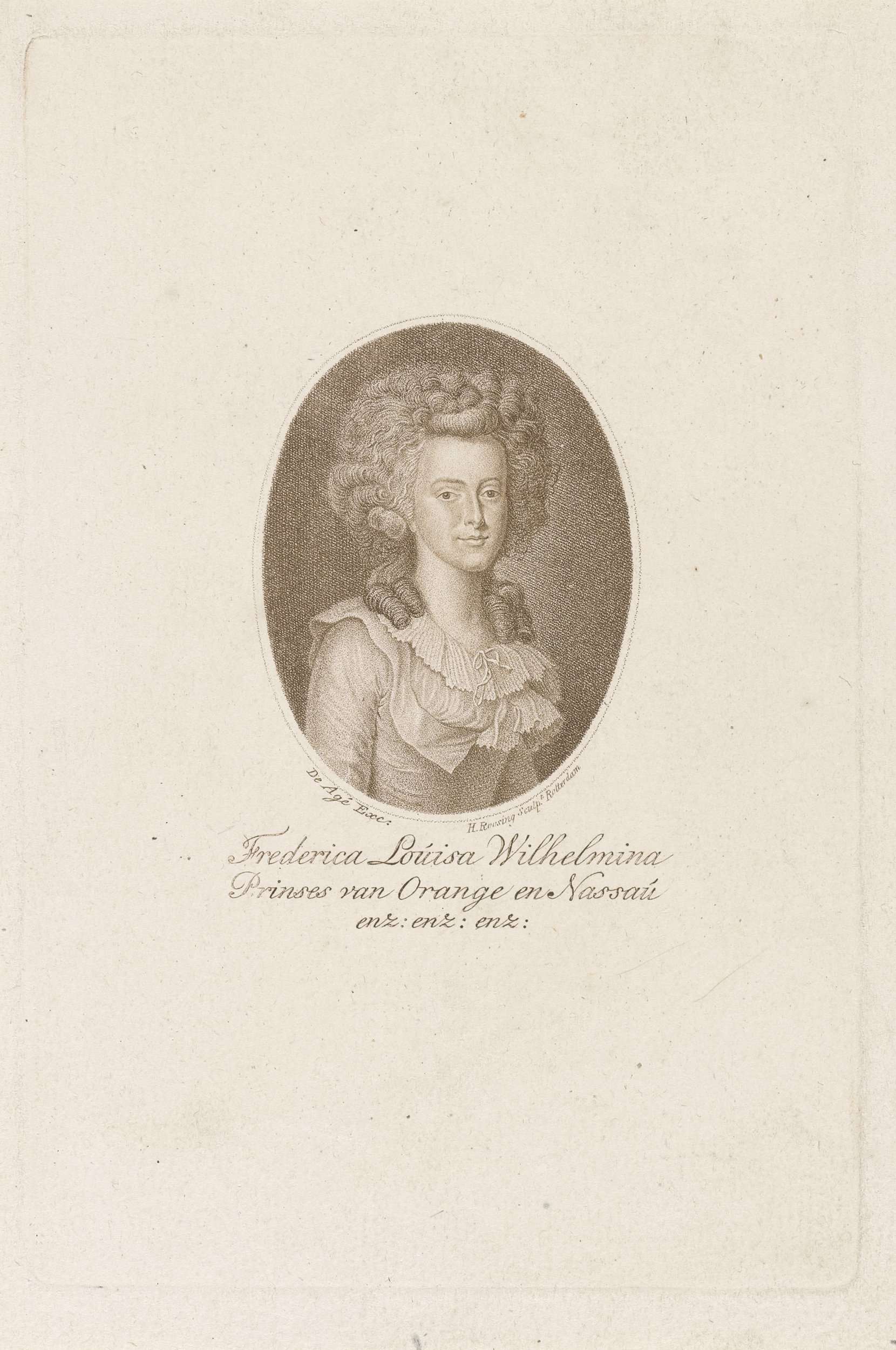 Portret van Frederica Louisa Wilhelmina, prinses van Oranje-Nassau. Dochter van prins Willem V. Onder het portret haar naam en titel.
