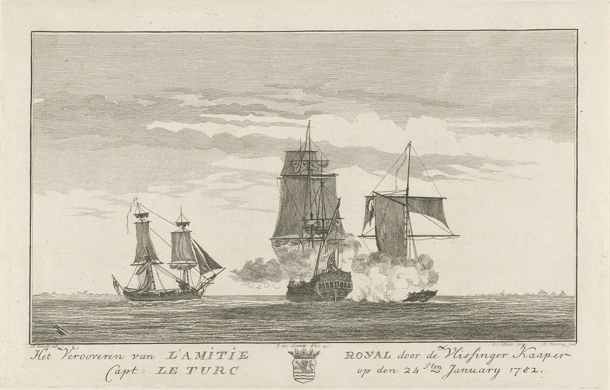 De verovering van de Franse Oostindiëvaarder L'Amité Royale op de Britten door de kaperkapitein Pierre le Turcq met het schip de Vlissinger, 24 januari 1782. Onderdeel van een groep van vijf illustraties van de veroveringen door Pierre le Turcq in 1782. In de marge de titel met in het midden het wapen van Zeeland.
