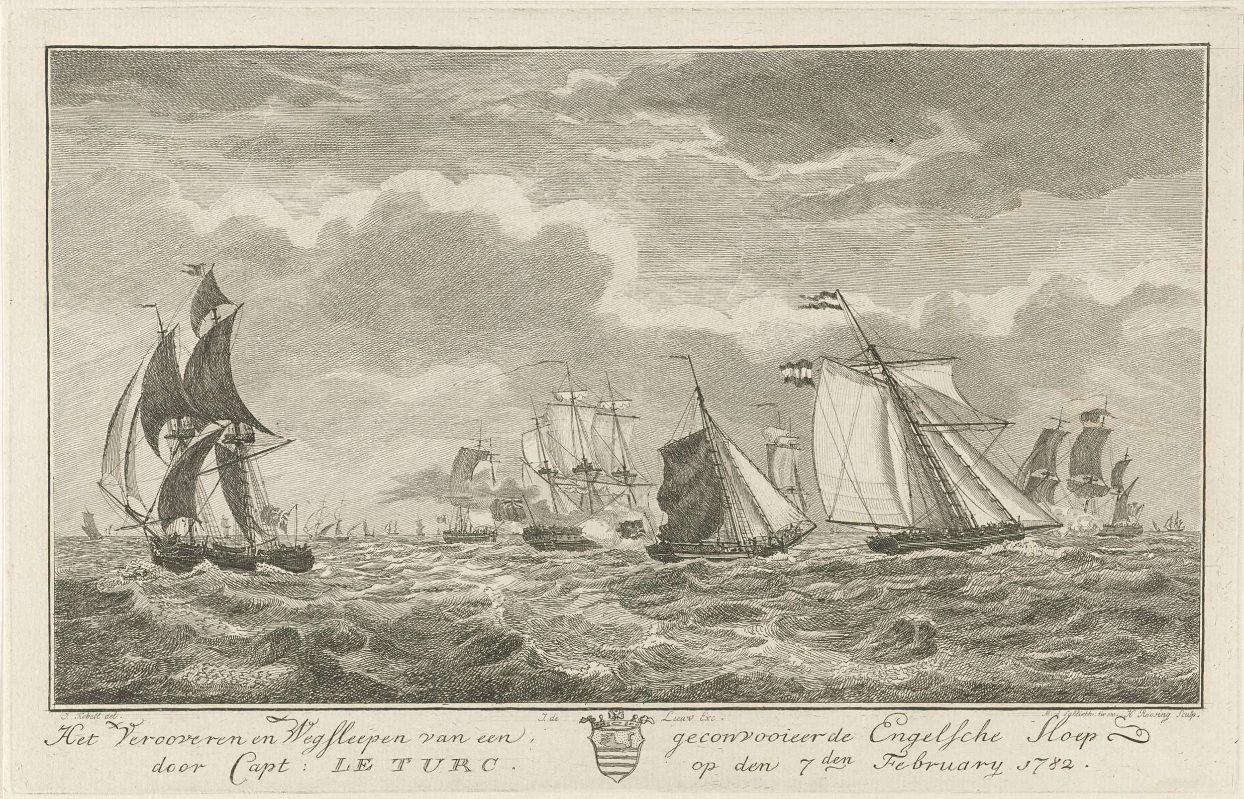 Het veroveren en wegslepen van een Engelse sloep uit een kovooi door de kaperkapitein Pierre le Turcq met het schip de Vlissinger, 7 februari 1782. Onderdeel van een groep van vijf illustraties van de veroveringen door Pierre le Turcq in 1782. In de marge de titel met in het midden het wapen van Zeeland.