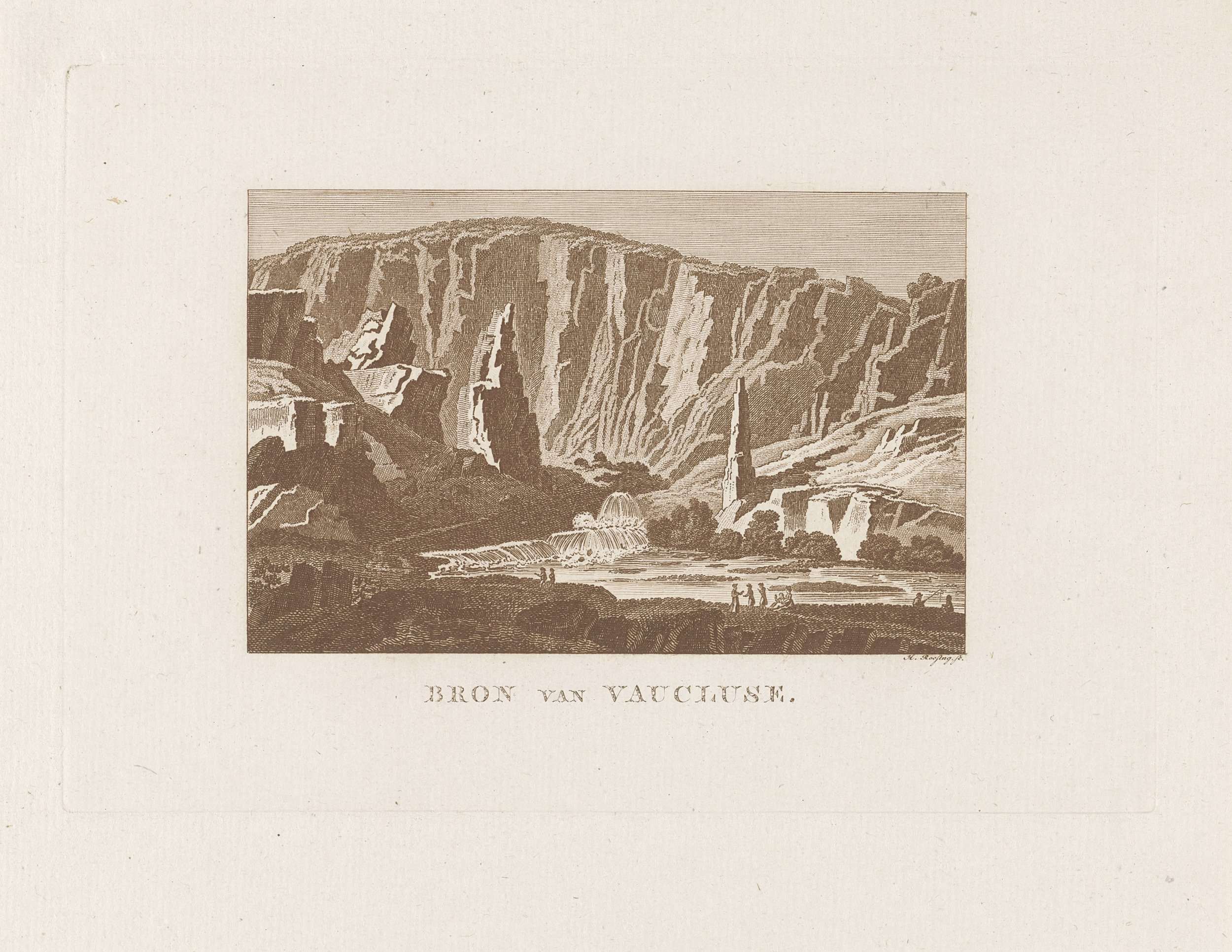 Gezicht op de bron van Vaucluse, in de omgeving van Avignon. Op de voorgrond enkele wandelaars en een visser.