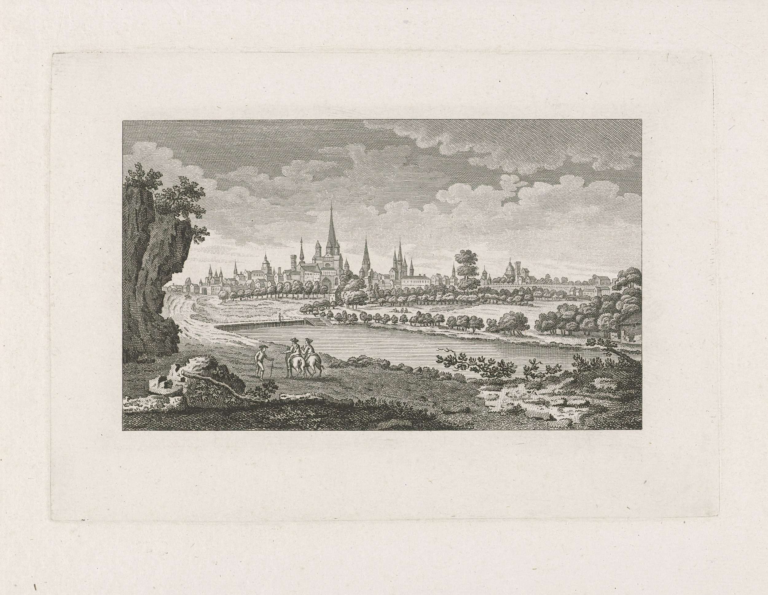 Gezicht vanuit het bos op de Franse stad Dijon. Op de voorgrond twee ruiters en een wandelaar.