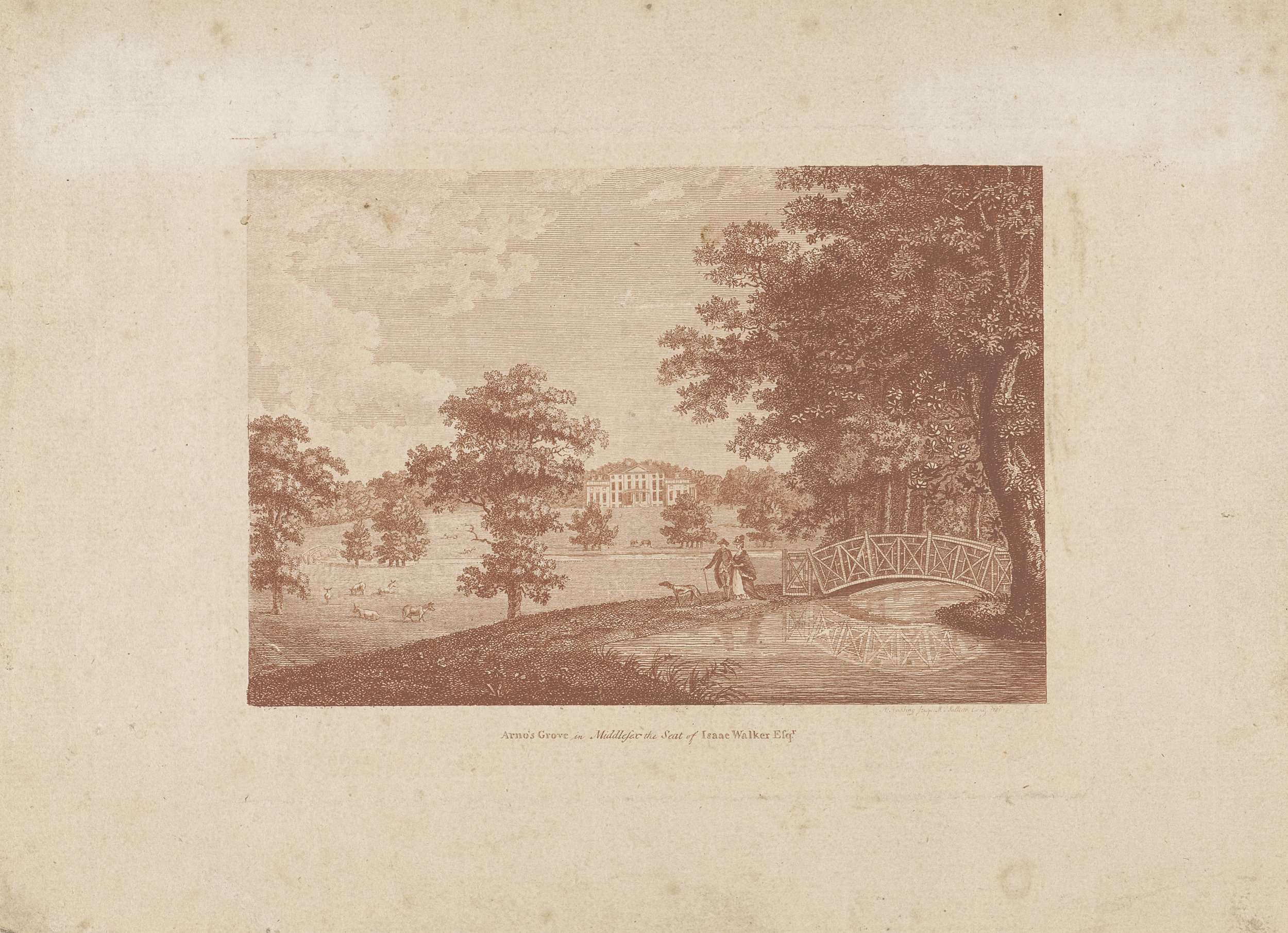 Gezicht op het landgoed Arnos Grove in het voormalige Middlesex, tegenwoordig London. Op de voorgrond een elegant gekleed paar met een hond bij een beek.