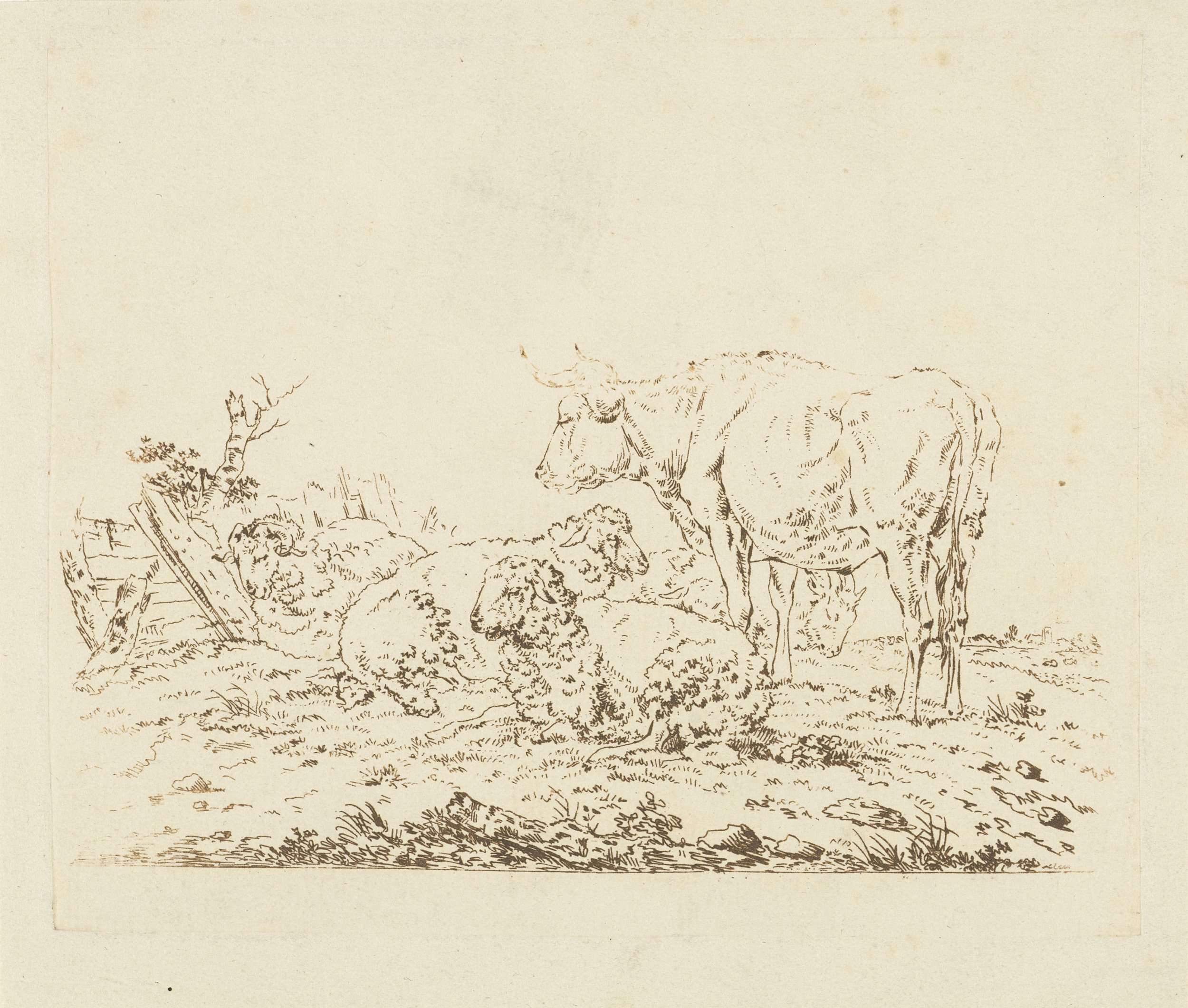 Weiland met koe en schapen