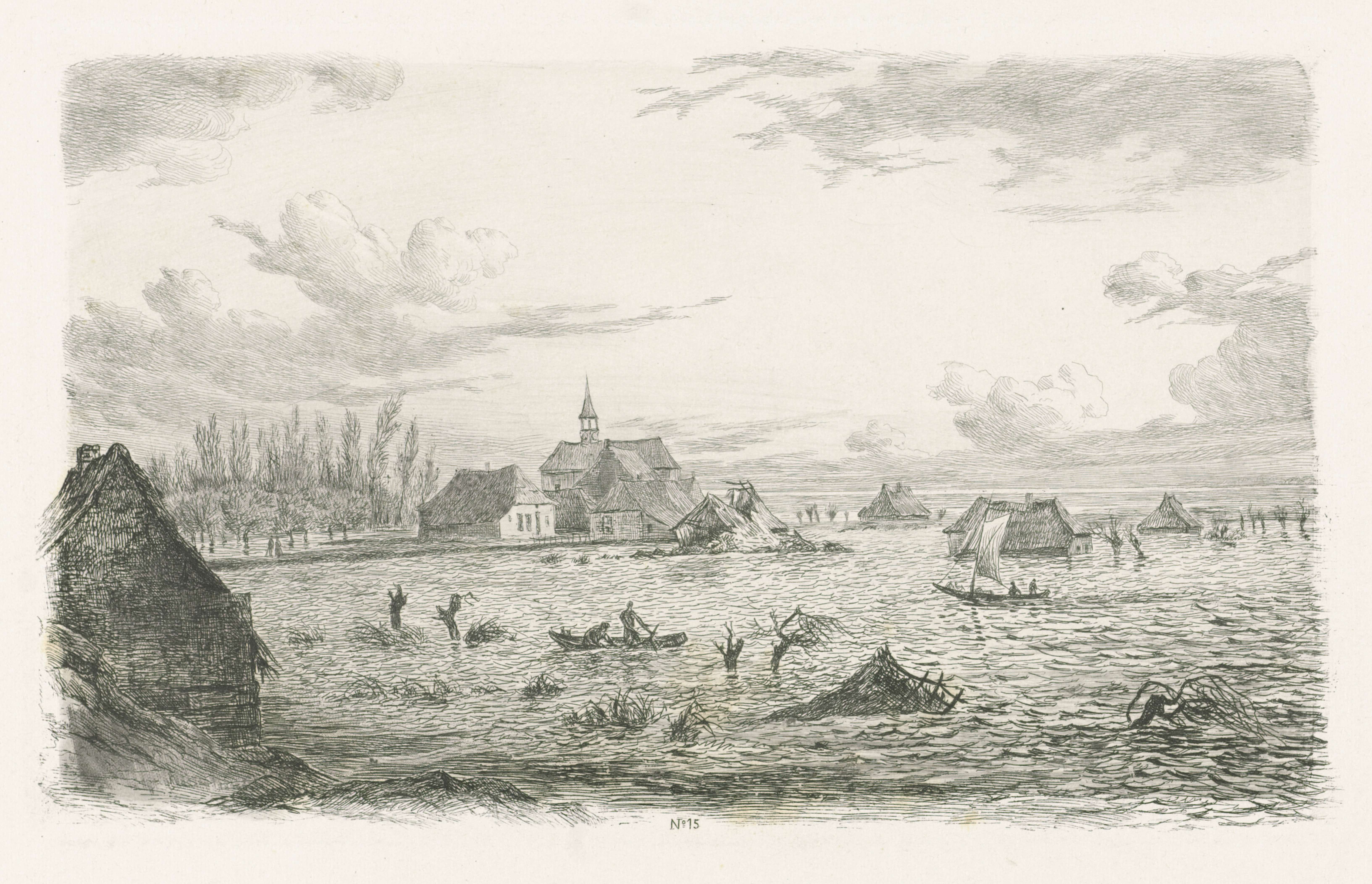 Overstroming in het dorp Kessel, met op de voorgrond een roei- en een zeilschip. De prent is deel van een serie van 24 prenten over de Watersnoodramp van 1855.
