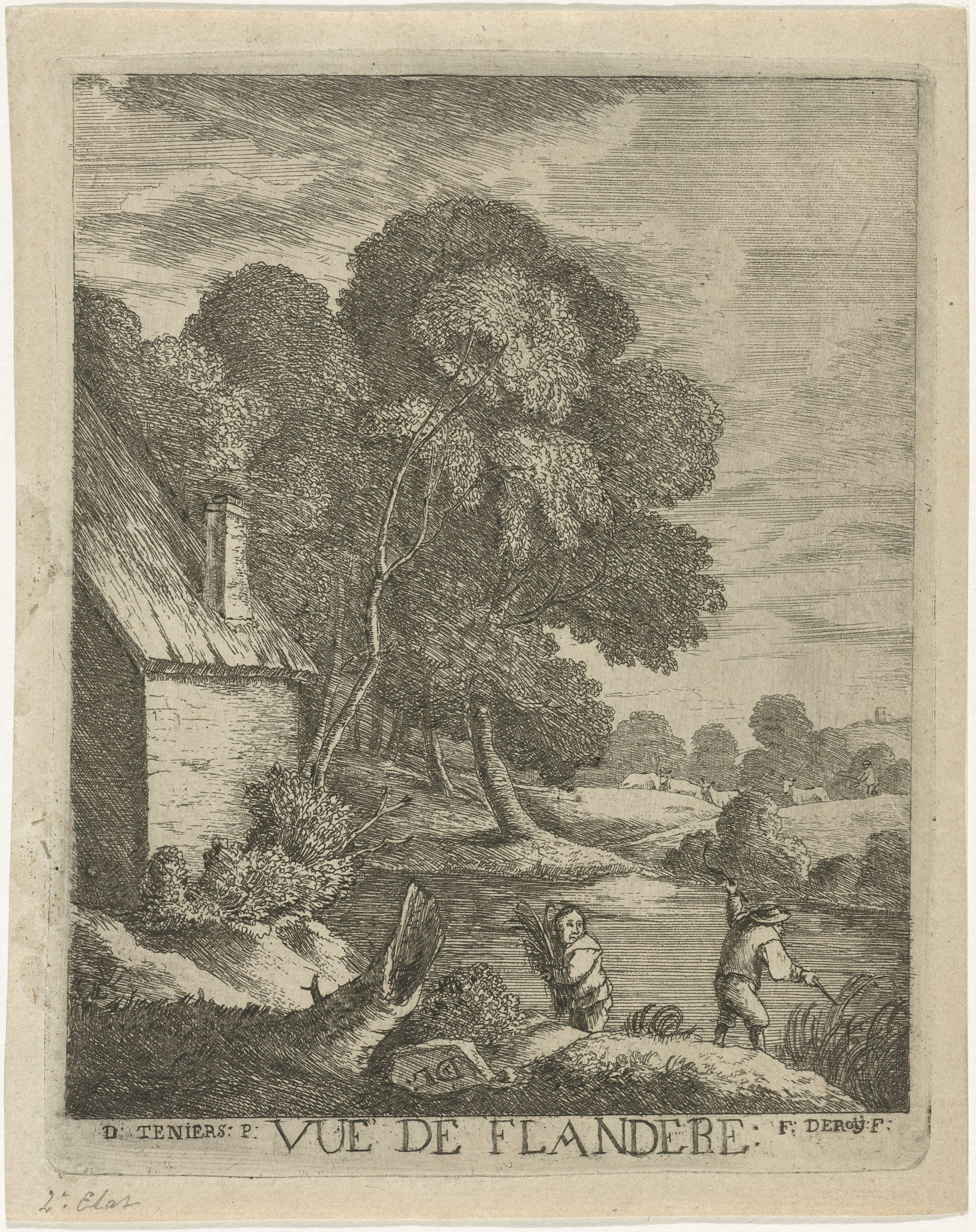 Gezicht op een Vlaams landschap, met op de voorgrond twee mannen bij een vijver. Links een huis en op de achtergrond een herder met zijn kudde.
