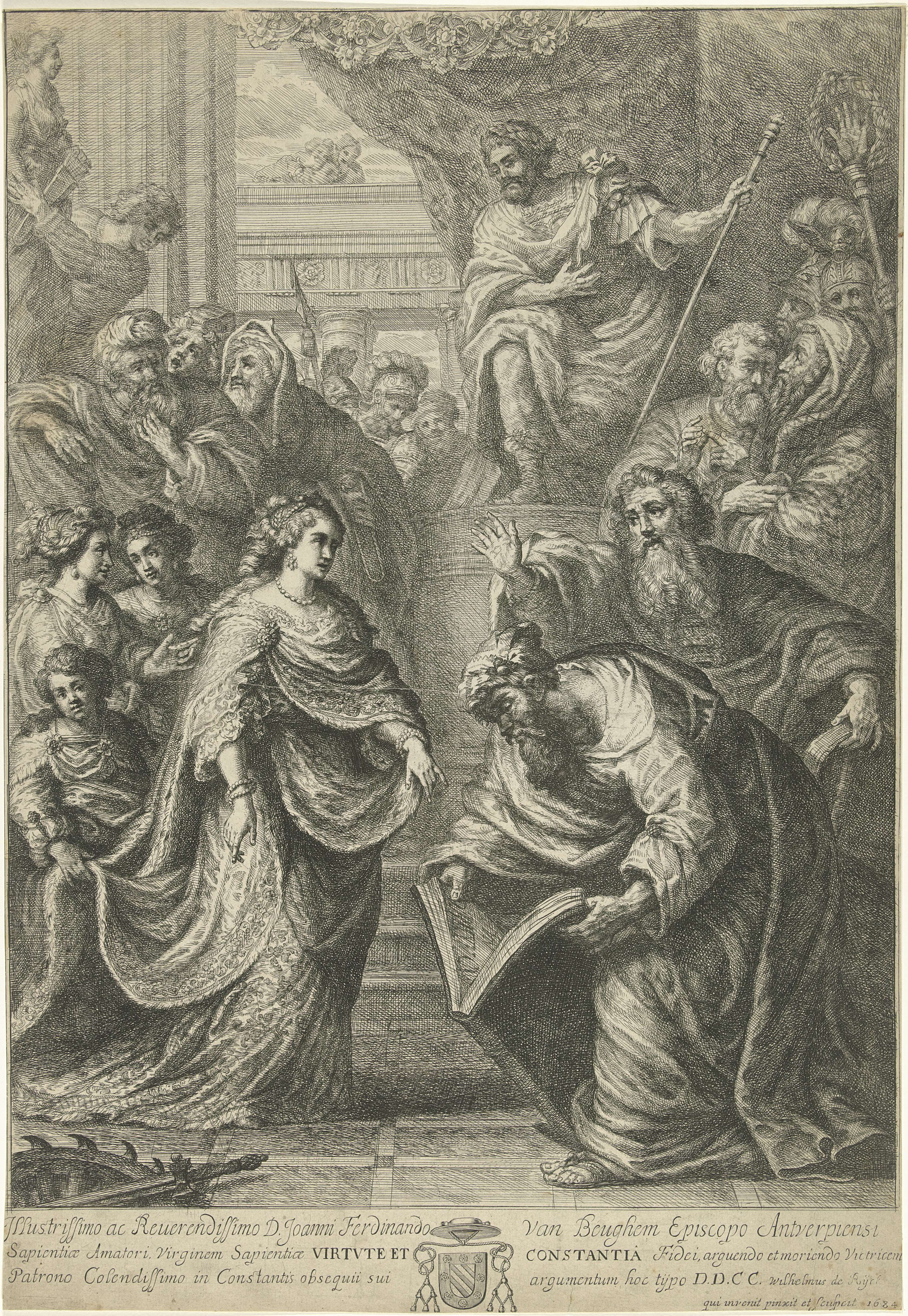 De heilige Catharina van Alexandrië staat voor de rechters die haar veroordeling voorlezen. Keizer Maxentius kijkt toe vanaf zijn troon. Op de voorgrond een zwaard en een rad met ijzeren punten.