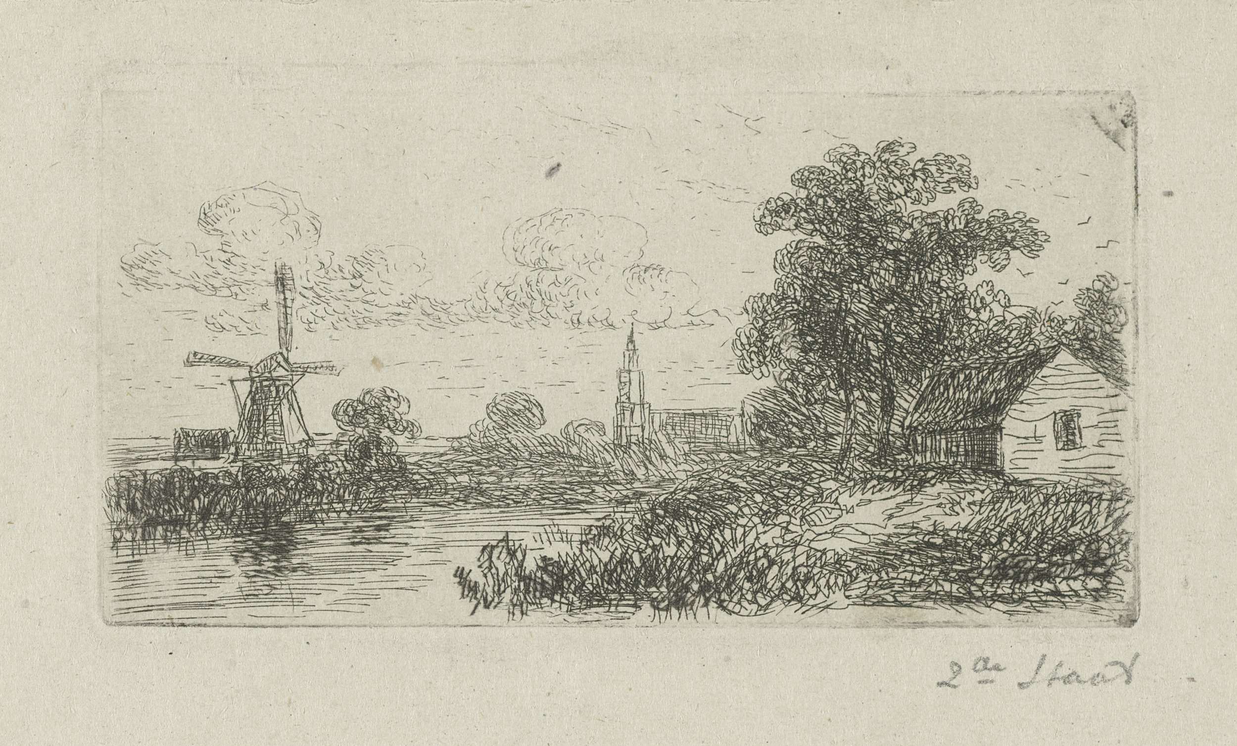 Landschap met molen en kerk