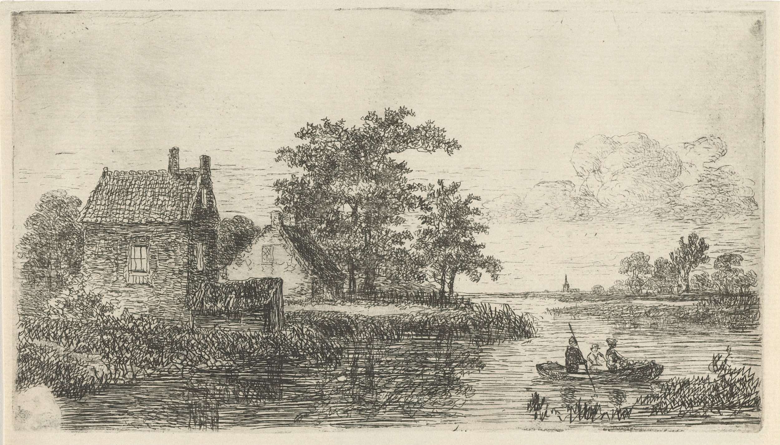 Riviergezicht met drie mannen in een boot en aan de waterkant twee woningen. Op de achtergrond de contouren van een kerk.