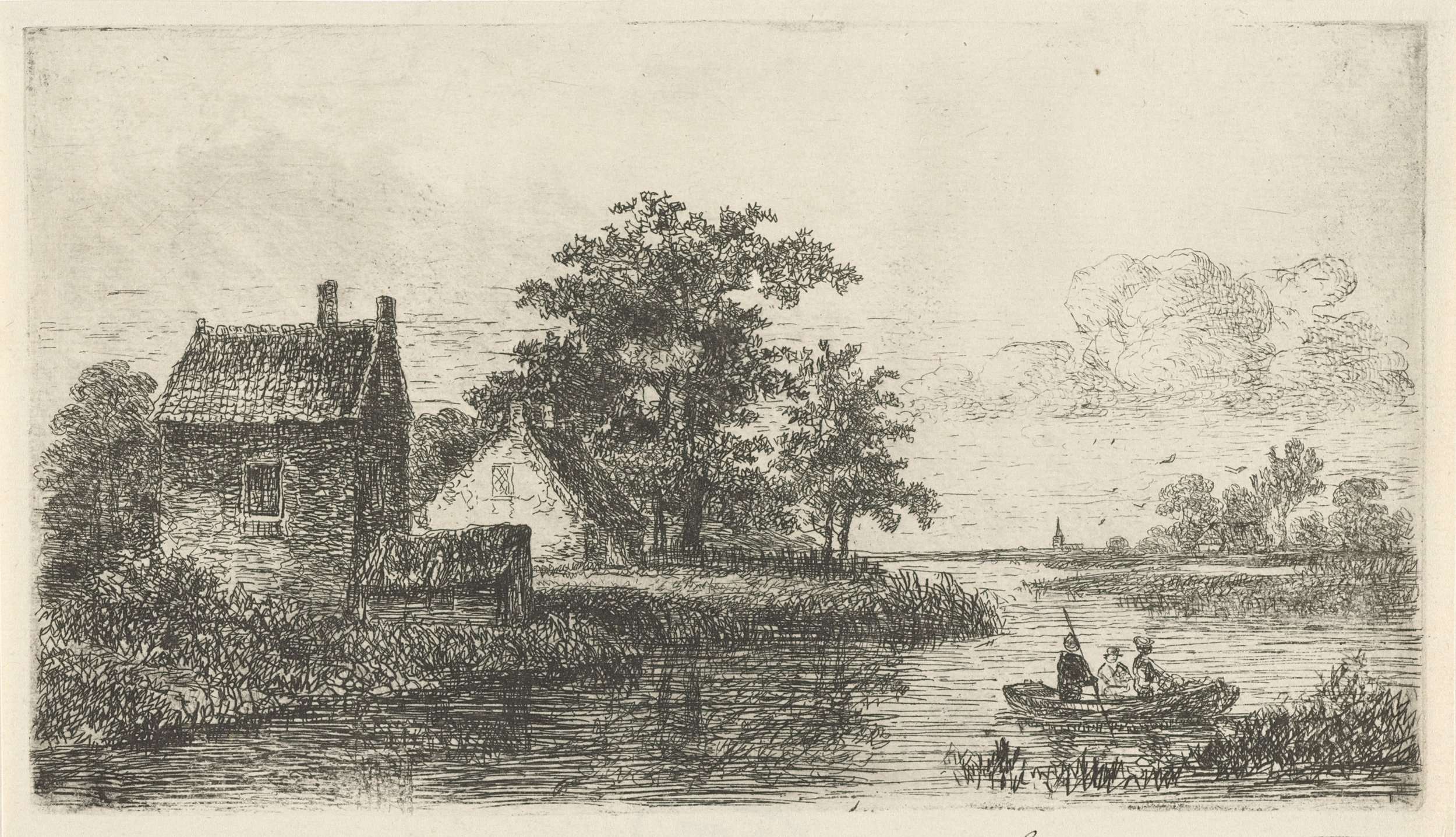 Riviergezicht met drie mannen in een boot en aan de waterkant twee woningen. Op de achtergrond de contouren van een kerk.