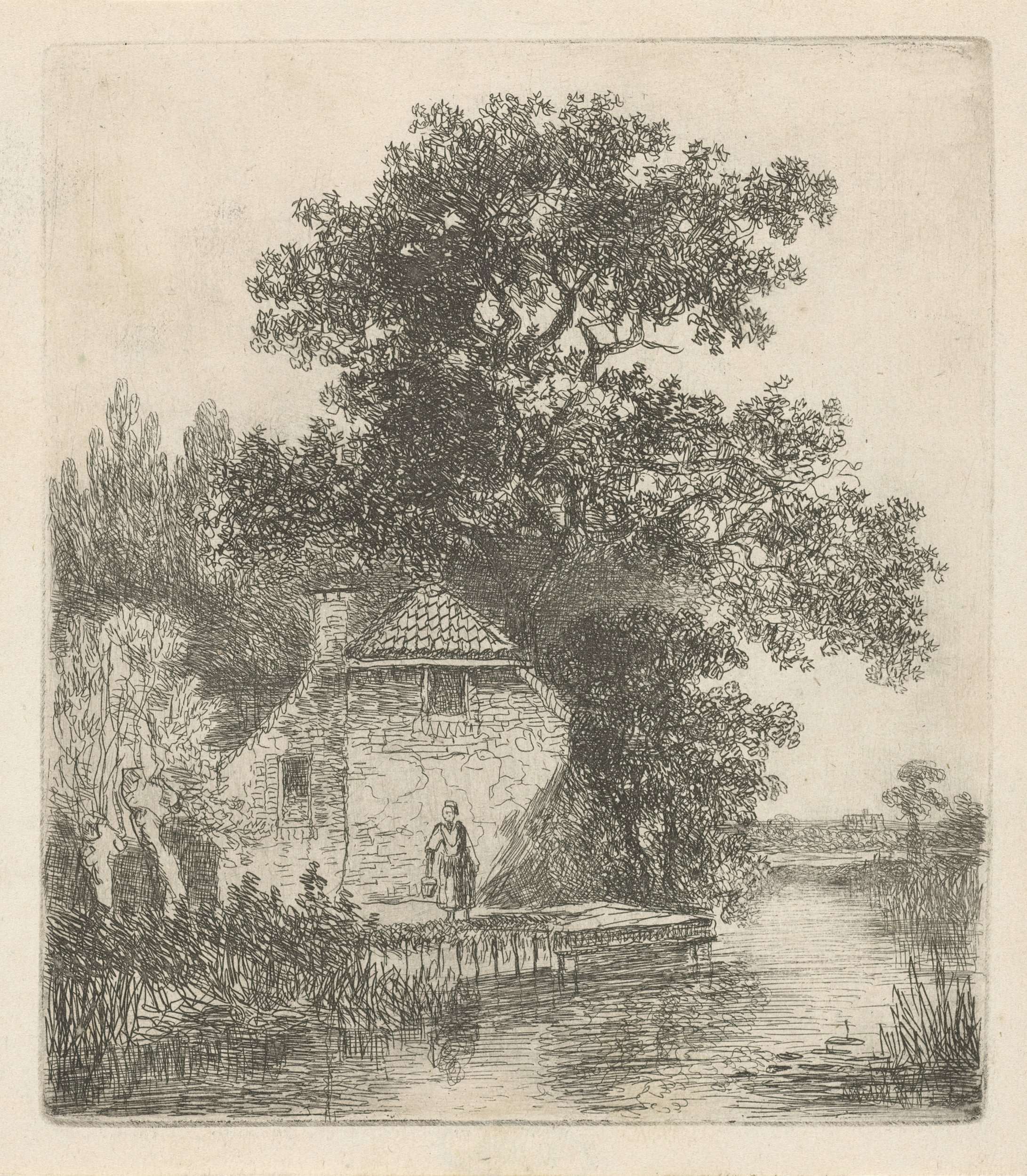 Vrouw voor een boerderij aan het water