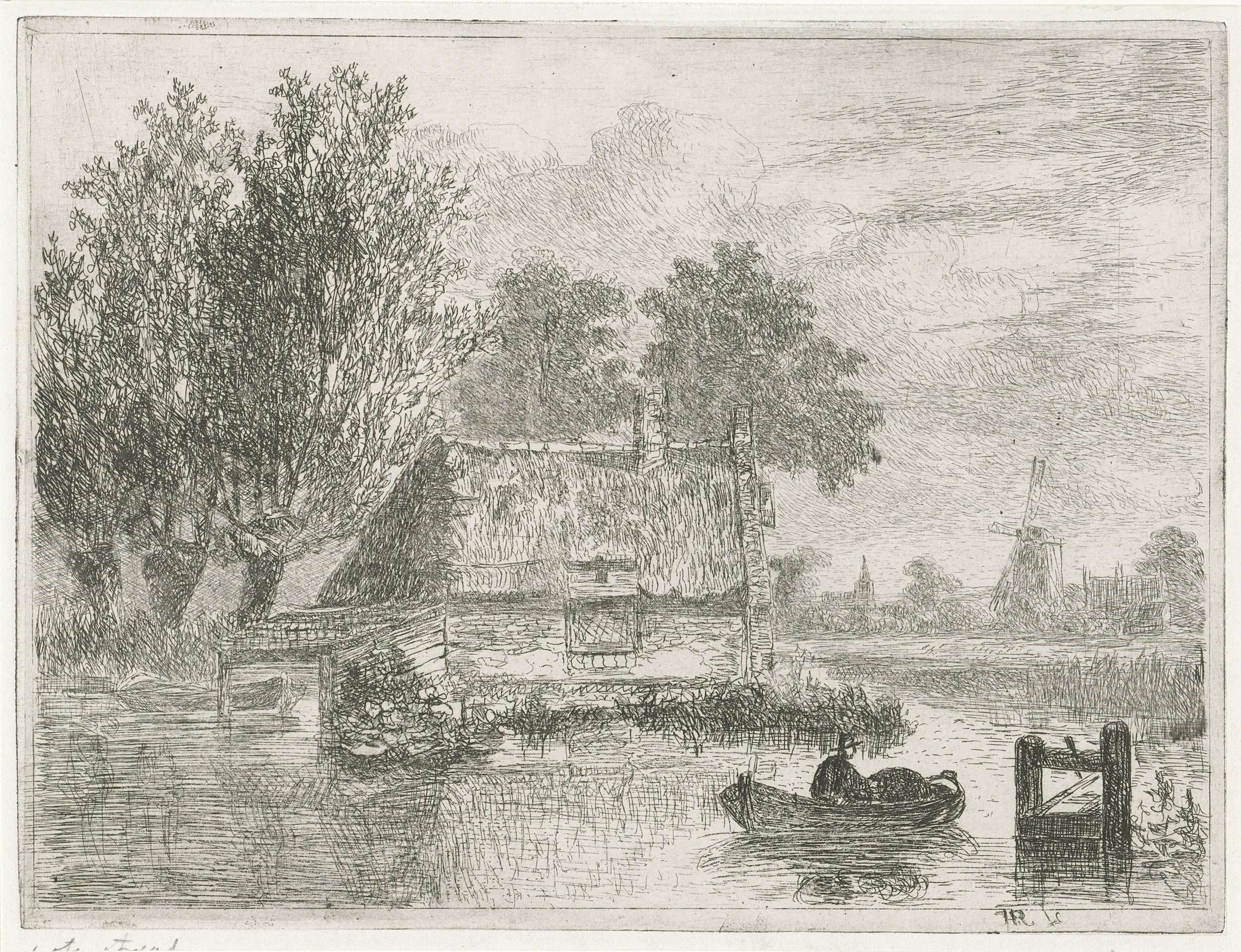 Gezicht op een rivierlandschap met op de voorgrond een man met een ton in een boot. Links een boerderij en op de achtergrond de contouren van een dorp met een kerk en een molen.