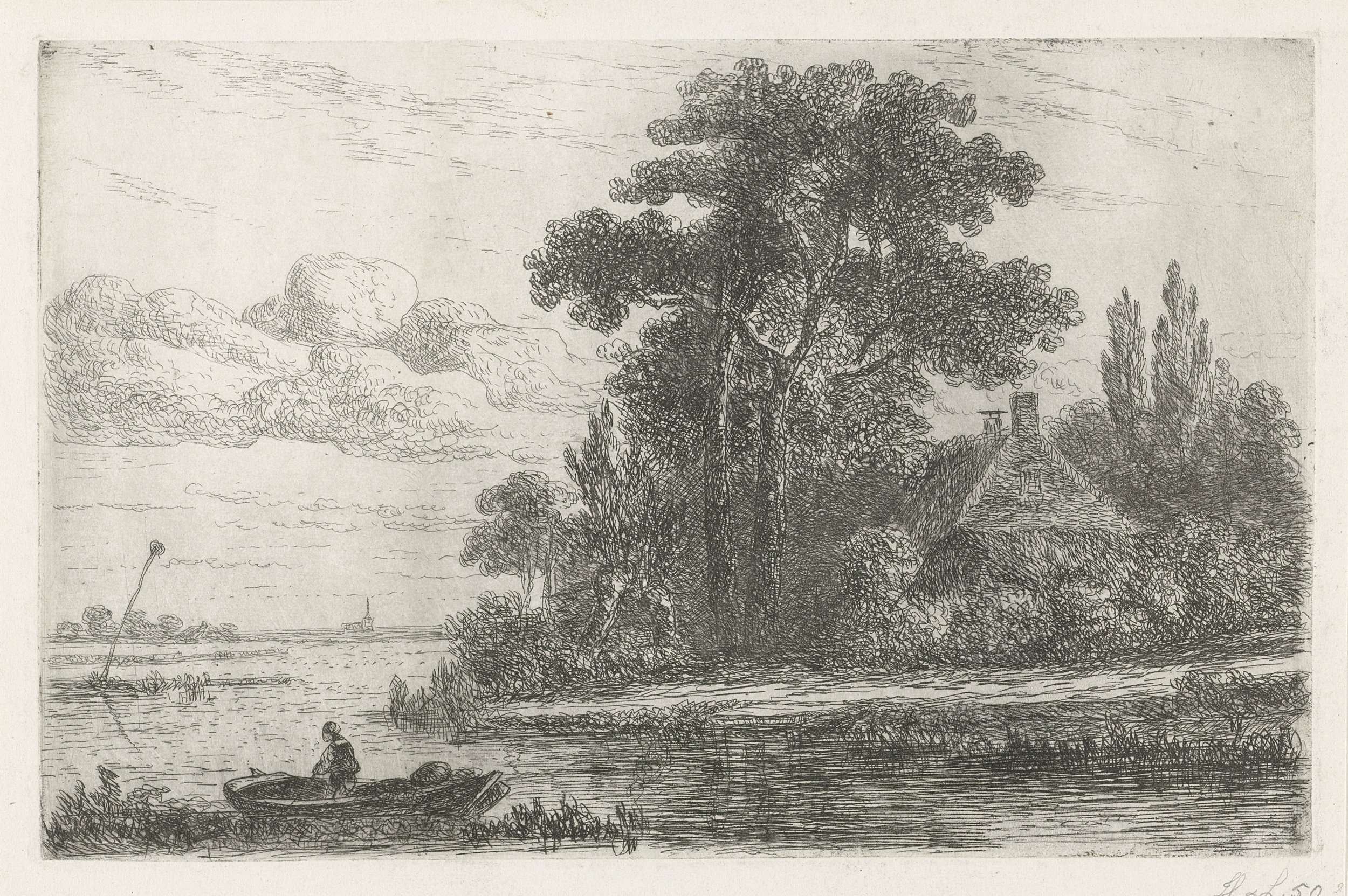 Een rivierlandschap met links een baken en op de voorgrond een visser in een boot. Rechts een boerenhoeve en op de achtergrond de contouren van een kerk.
