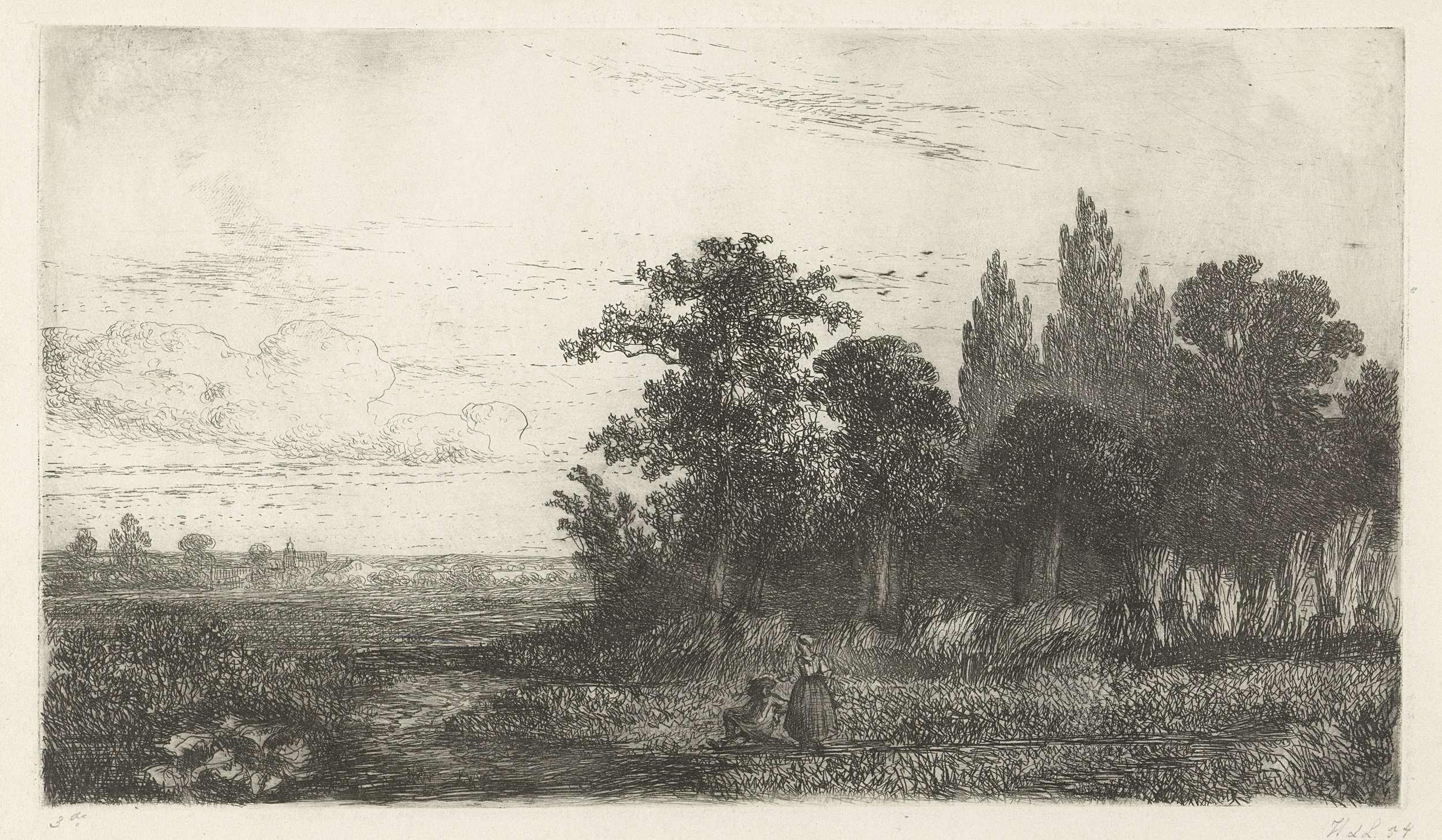 Gezicht op de rand van een bos, waar zich bij een beekje een man en een vrouw met een mand bevinden. De man zit en de vrouw staat. Op de achtergrond de contouren van een kerk.