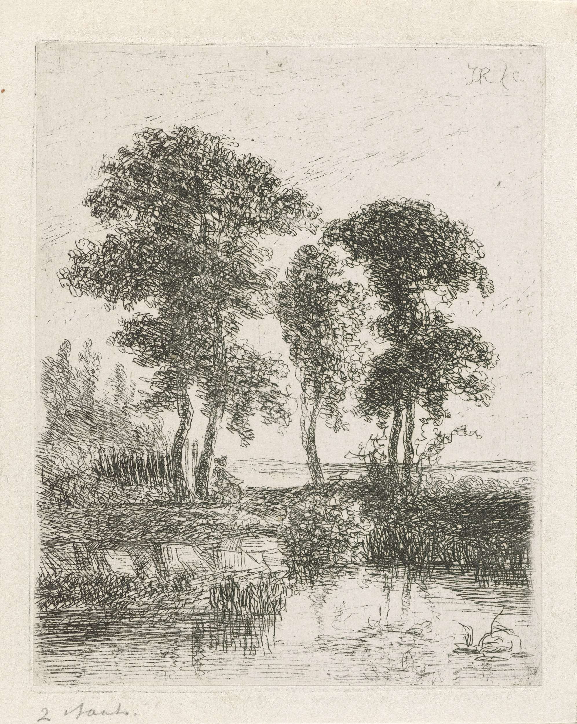 Figuur bij een boom aan de waterkant