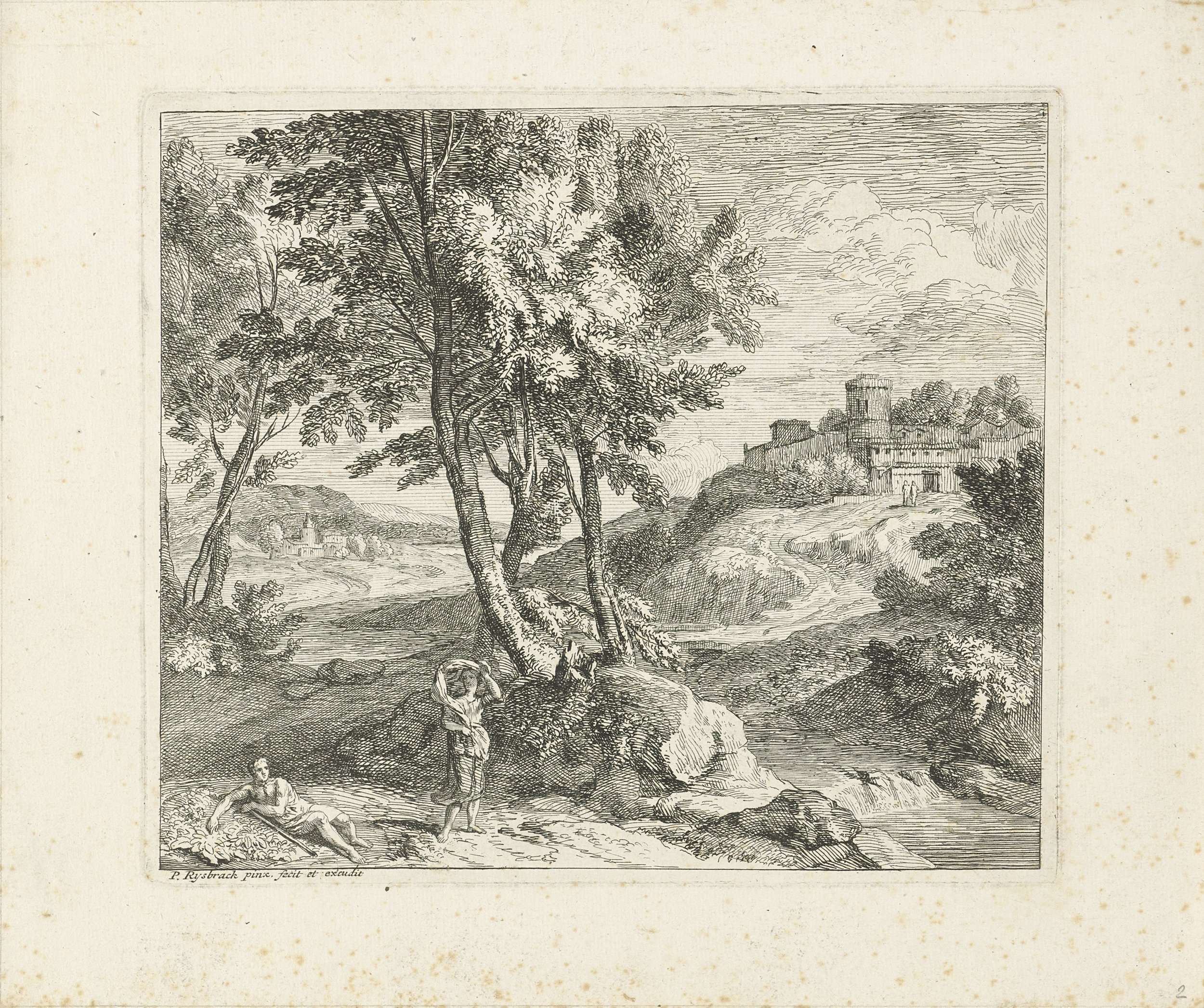 Gezicht op een heuvelachtig landschap waar zich aan de waterkant van een rivier een man en een vrouw bevinden. De man ligt en de vrouw staat en draagt een sluier. Op de achtergrond de contouren van twee steden.