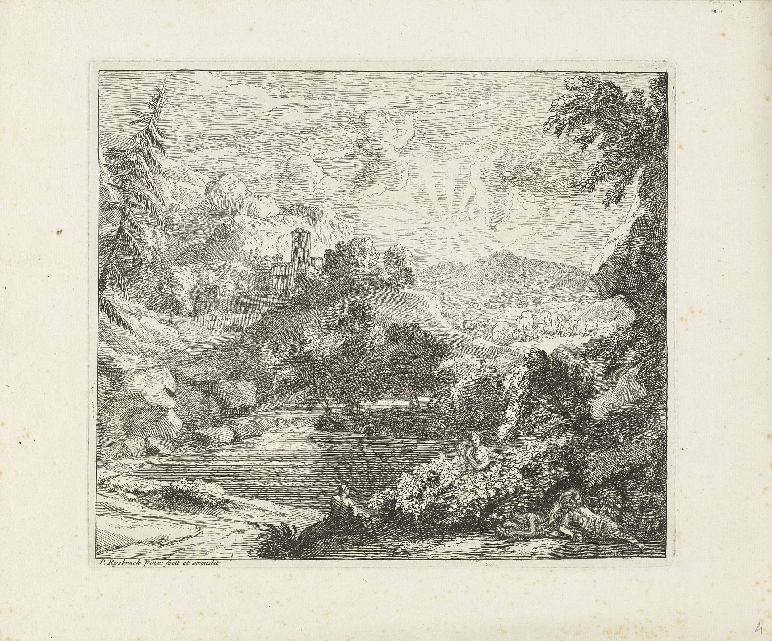 Gezicht op een heuvelachtig landschap met een zonsopgang. Op de voorgrond een meer waarbij drie figuren liggen te rusten. Zij worden vanuit de bosjes door twee figuren begluurd. Op de achtergrond de contouren van een stad.