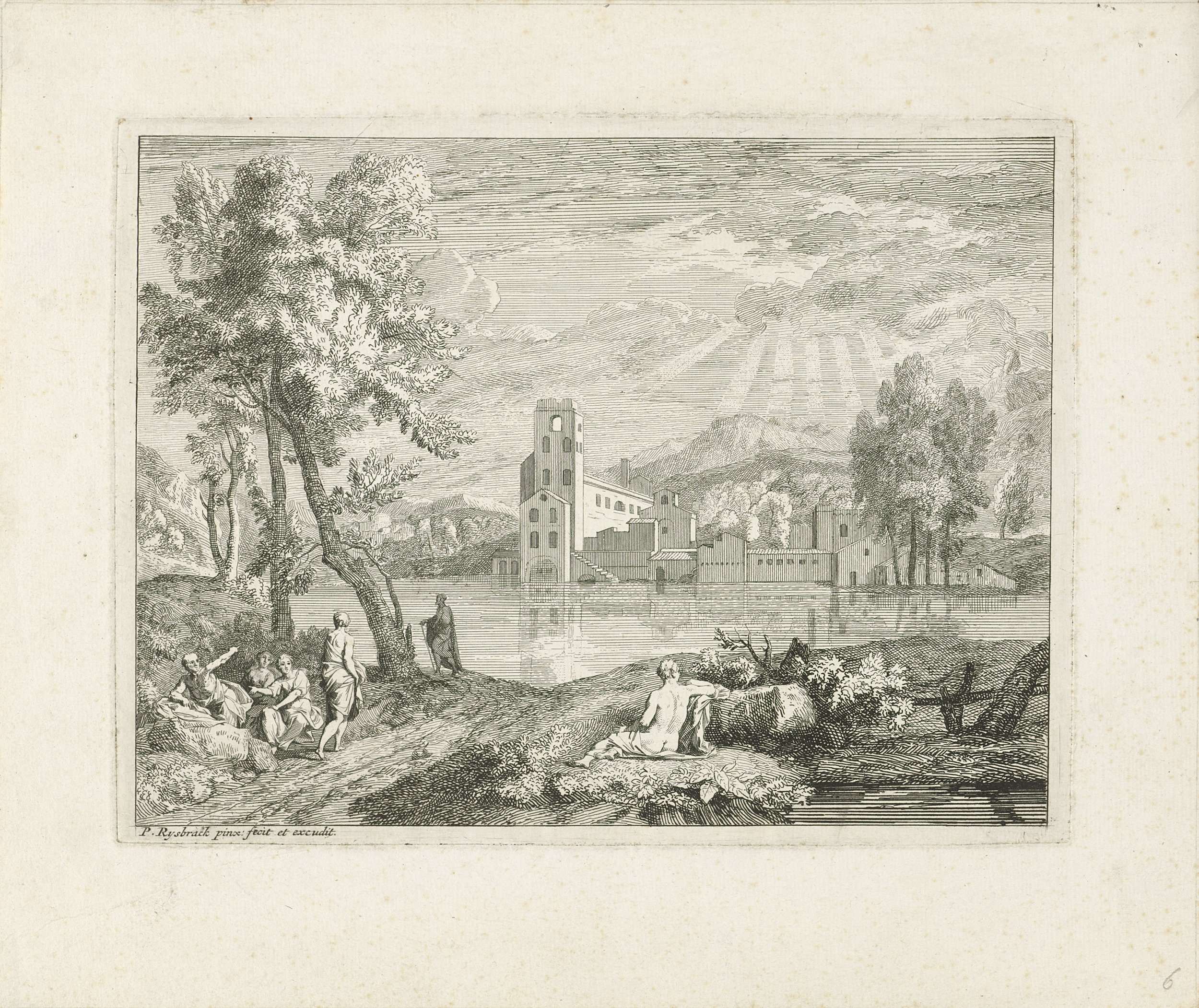 Gezicht op een heuvellandschap met op de voorgrond een rivier waarbij zich enkele figuren bevinden. Rechts op de voorgrond een naakte vrouw van op de rug gezien. Op de achtergrond de contouren van een stad.