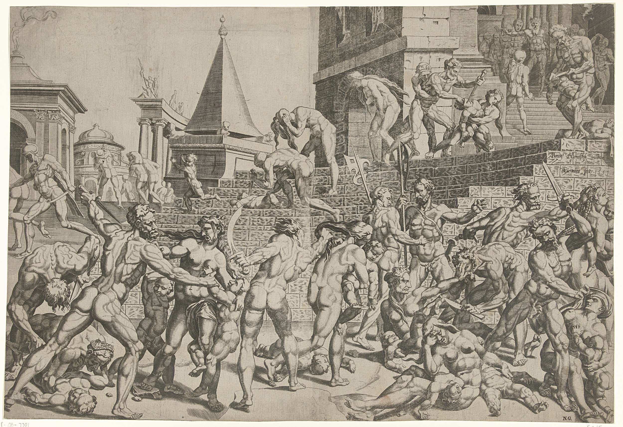 De soldaten van Herodes vermoorden alle jongens van twee jaar en jonger in Betlehem. De moeders van de kinderen proberen ze tegen te houden. In de achtergrond geeft Herodes het bevel tot het bloedbad.