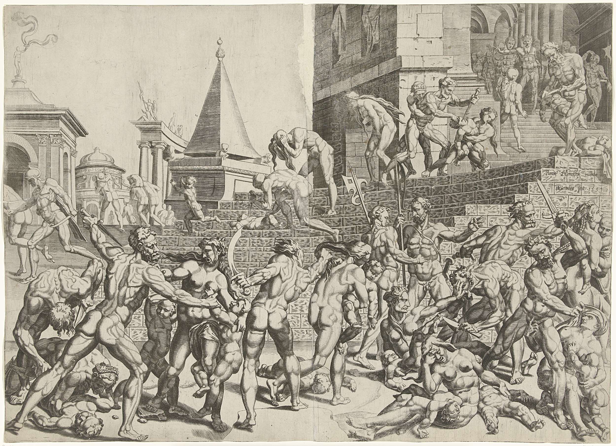 De soldaten van Herodes vermoorden alle jongens van twee jaar en jonger in Betlehem. De moeders van de kinderen proberen ze tegen te houden. In de achtergrond geeft Herodes het bevel tot het bloedbad.