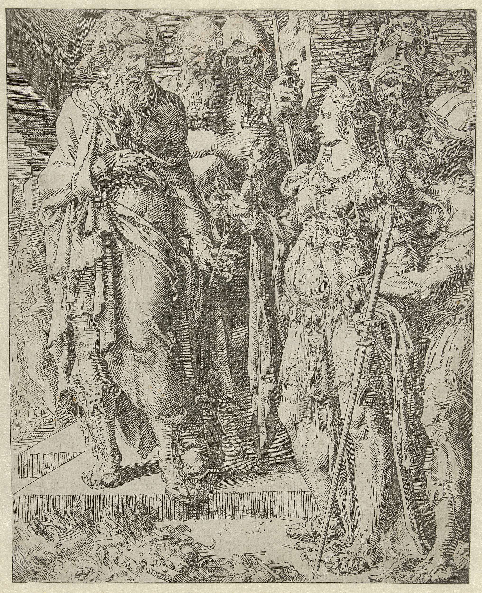 Op weg naar de brandstapel toont Tamar de ring, armband en staf die ze van Juda heeft gekregen als onderpand. Hierdoor bewijst ze dat Juda verantwoordelijk is voor haar zwangerschap. De prent maakt deel uit van een serie over de geschiedenis van Juda en Tamar