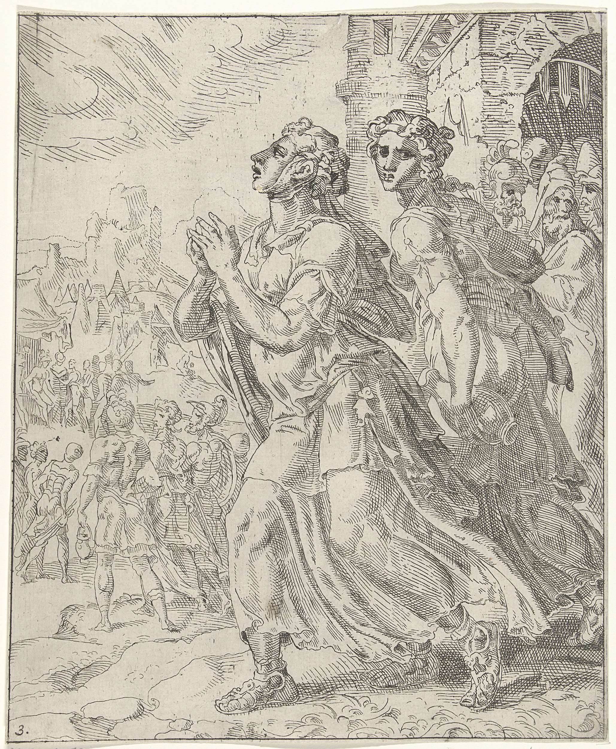Judit verlaat Bethulië samen met haar dienstmaagd. Ze bidden tot God. Op de achtergrond wordt ze door het Assyrische leger gevangen genomen en naar Holofernes gebracht. De prent maakt deel uit van een achtdelige serie die het verhaal vertelt van Judit en Holofernes.