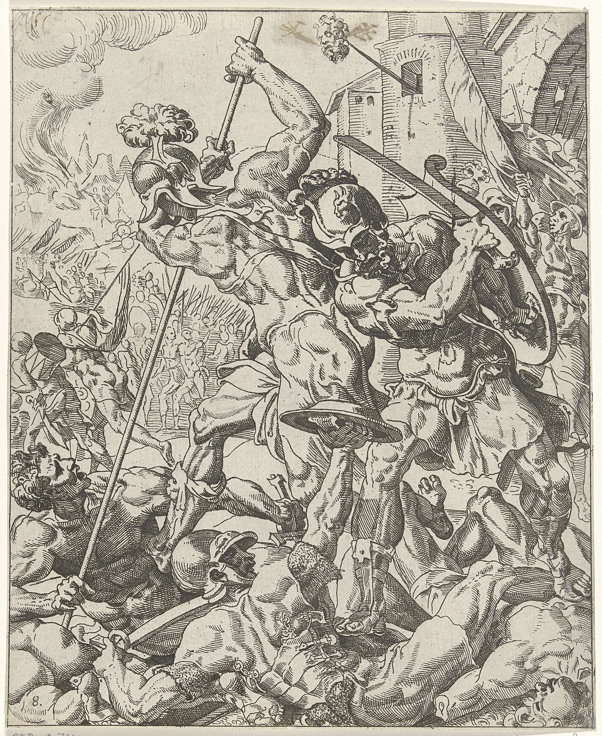 Bij het horen van de dood van Holofernes slaat het Assyrische leger op de vlucht. De Israëlieten achtervolgen het leger en slachten de Assyriërs af. De prent maakt deel uit van een achtdelige serie die het verhaal vertelt van Judit en Holofernes.