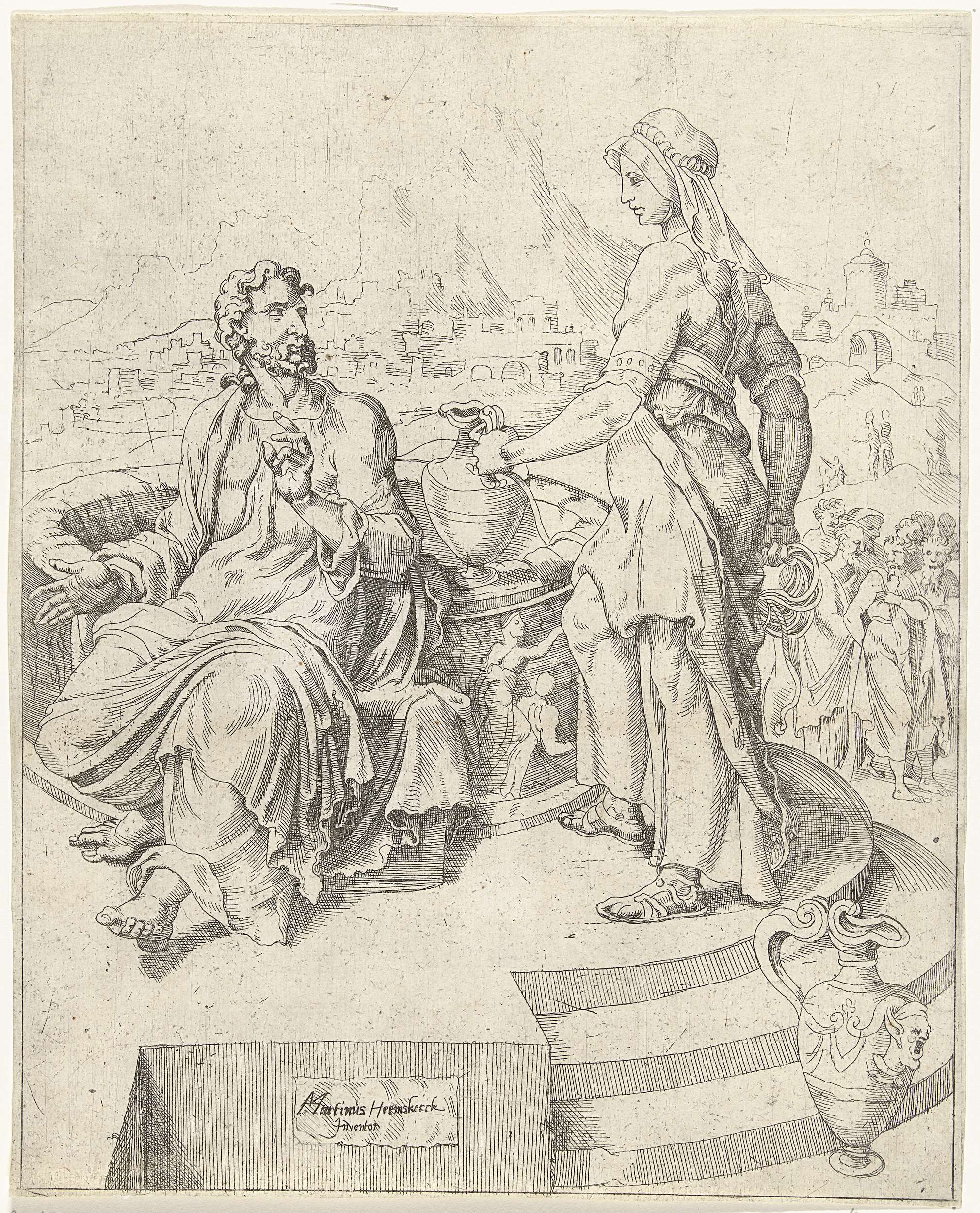 Christus is bij een bron in gesprek met een Samaritaanse vrouw. Hij vraagt haar om wat water uit haar kruik. De apostelen in de achtergrond (Johannes 4:1-30). De prent is deel van een dertigdelige serie met prenten over de zondeval en Christus' passie.