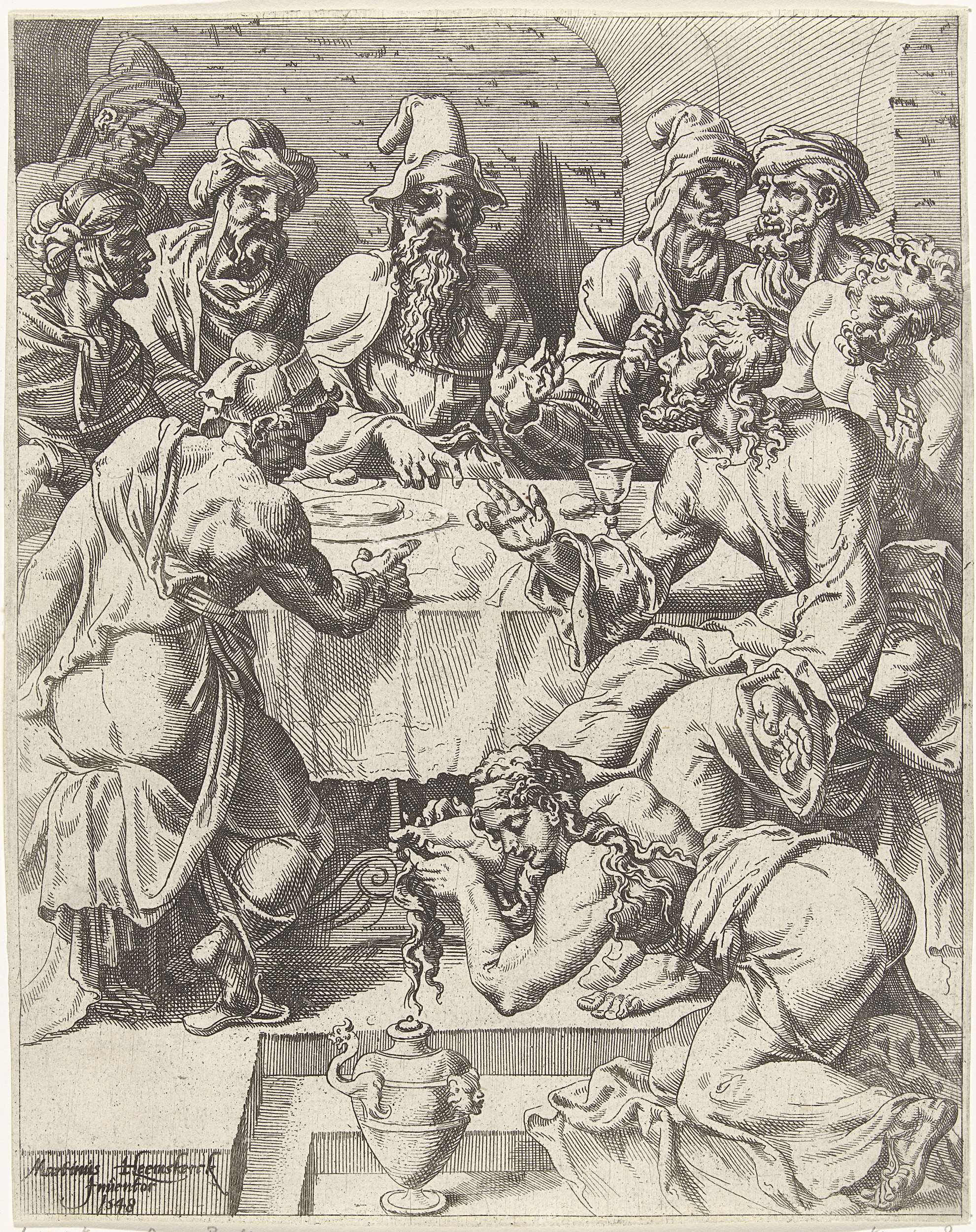 Maria Magdalena, een lichtekooi, droogt de voeten van Christus met haar haren. Ze gaat vervolgens de voeten zalven. Judas Iskariot protesteert, maar Christus legt uit dat men haar moet vergeven. De prent is deel van een dertigdelige serie met prenten over de zondeval en Christus' passie.