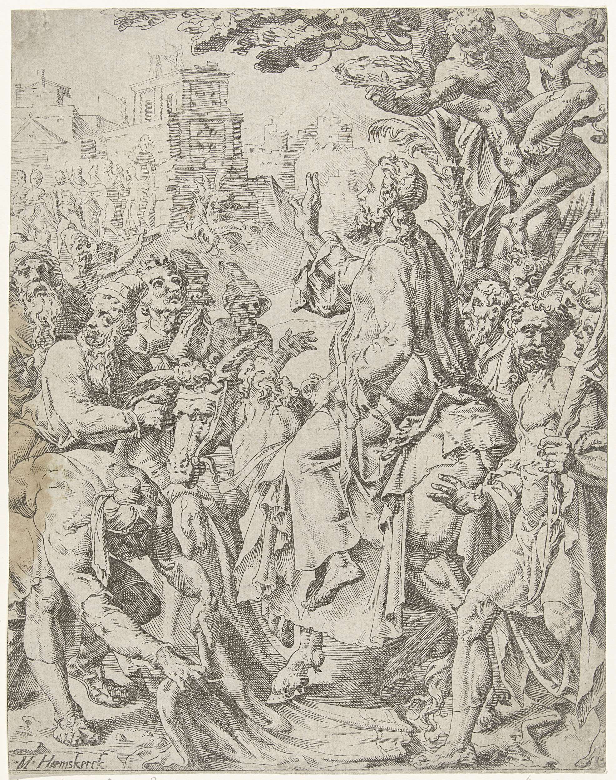 Christus, gezeten op een ezel, rijdt binnen in Jeruzalem. Rondom hem zwaaien mensen met palmtakken. Een man legt zijn mantel voor Christus neer op de grond. De prent is deel van een dertigdelige serie met prenten over de zondeval en Christus' passie.