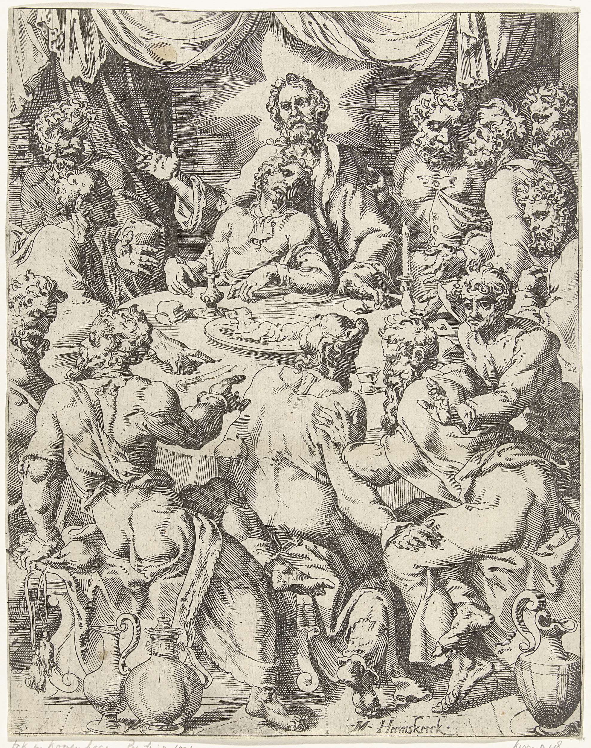Christus en zijn leerlingen rondom een ronde tafel. Christus vertelt zijn apostelen dat een van hen hem zal verraden. De apostelen verwerpen de voorspelling van Christus en discussiëren met elkaar. De prent is deel van een dertigdelige serie met prenten over de zondeval en Christus' passie.