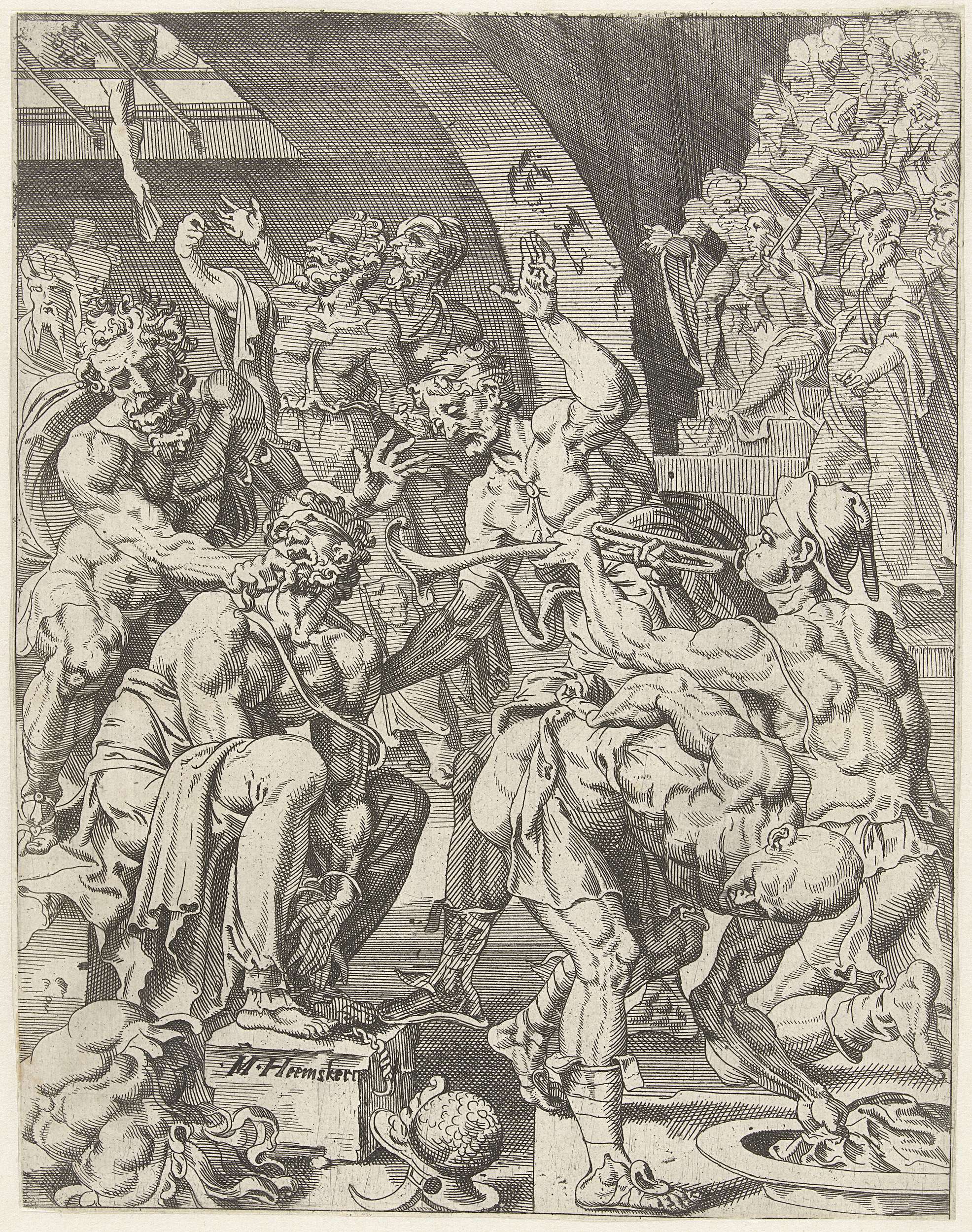 Christus wordt bespot door de soldaten in de gevangenis. Hij is geblinddoekt en gebonden. Soldaten slaan, spotten, en vernederen hem. De prent is deel van een dertigdelige serie met prenten over de zondeval en Christus' passie.
