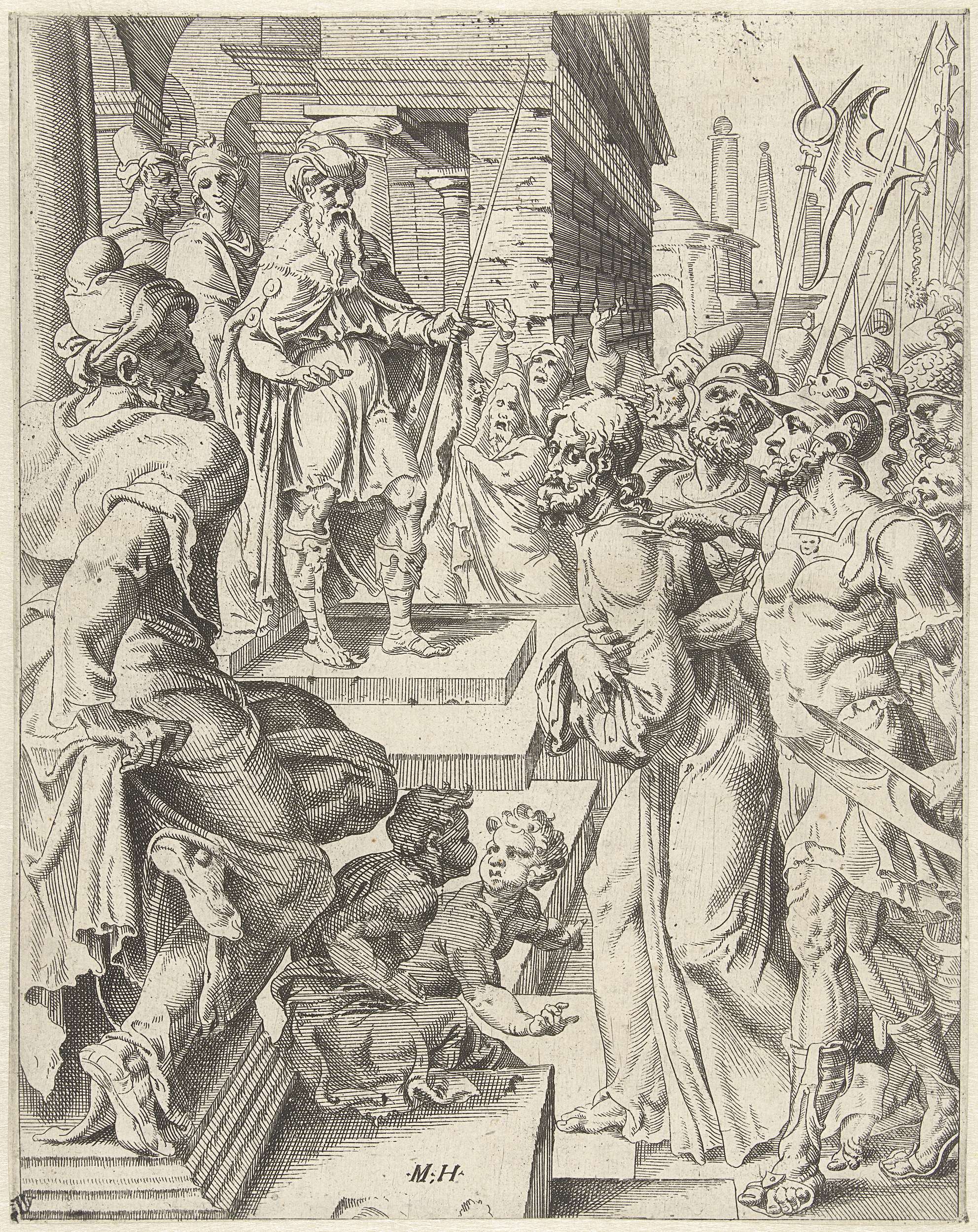 Christus wordt voor Pilatus gebracht. De menigte schreeuwt om zijn executie. De prent is deel van een dertigdelige serie met prenten over de zondeval en Christus' passie.